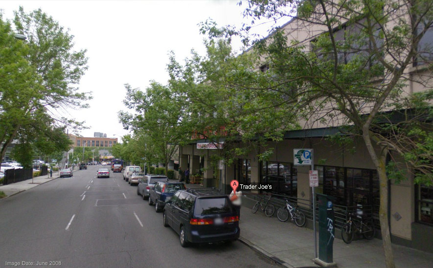 Unfortunately this building plan actually decreases density. You’re essentially replacing two-story mixed-use buildings with a single-story surface lot. It’s unfortunate, because Trader Joe’s is not averse to building stores in mixed-use urban areas. Their store in Boston’s Coolidge Corner (actually Brookline) is in a great three-story building and fits well with the dense fabric of the area. Their store in Seattle’s University District is similar, a two-story building along a dense commercial street with parking in the back. When the city is sacrificing historical property and messing with long-standing zoning rules, and particularly along one of the city’s main streets, shouldn’t the city be setting higher standards for developers? Shouldn’t they be asking for more than just a little plaza by the parking lot? Minneapolis isn’t Boston or Seattle, but is asking for a mixed-use development for this site unreasonable?