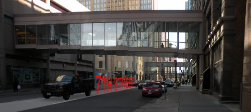 Hennepin Avenue seems like the most obvious candidate for this transformation, and it could use the work. However, I have a vision in my head of a large car-less intersection in the middle of the city, preferably with streetcars (but I’ll keep dreaming on that one). So, for my hypothetical study I need to find a street that runs perpendicular to Nicollet Mall and whose buildings could accommodate tenants that contribute to street-level pleasantness. I took a walk yesterday to scope out where I would put my “Cross-street Mall”. I eventually decided on 7th Street, which happens to be the corner of Nicollet that the Crystal Court rests on.