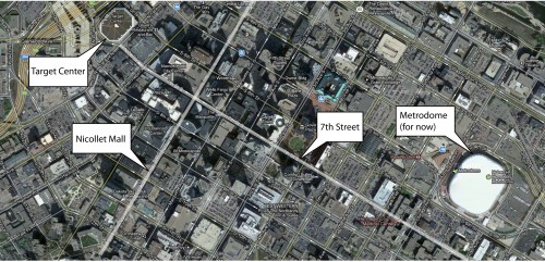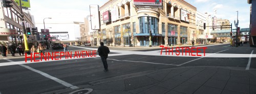I chose 7th Street simply because it seemed most plausible, or rather, least implausible. I like that it starts at the Target Center and First Avenue (the club, not the avenue), and that it ends roughly where the new Vikings stadium will be. It’s kind of like our own little Avenue des Champs-Élysées, only with more skyways.