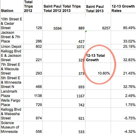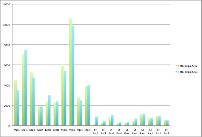 Meanwhile over in downtown Saint Paul, ridership grew 10% over the (shorter) 2012 Nice Ride season. Some of the stations saw dramatic increases (especially 10th and Cedar), and usage grew at practically all of the ten locations except for the two along Kellogg Boulevard. The Landmark center remains the #1 Nice Ride location in all of Saint Paul, with about 1,100 trips during the season.