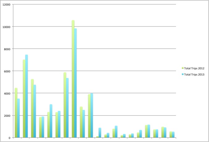 That said, Saint Paul ridership is very low compared to the Minneapolis part of the system. Looking at the two downtown populations, we might expect something like a 4:1 ratio between ridership numbers, but instead we see a 7:1 ridership gap (45K in Mpls v. 6200 in StP). Granted, that’s a bit better than last year, but with a longer Nice Ride “season”, you’d have to expect some growth. It seems that pretty much everything I said in April’s post remains true in 2013.