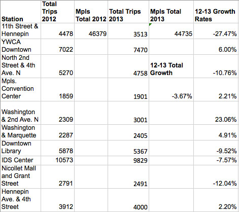 The ten stations I looked at in downtown Minneapolis actually saw a decrease in ridership of about 3%! Who knows why this happened. Could have been weather or maybe just some statistical noise. Maybe the market is saturated?