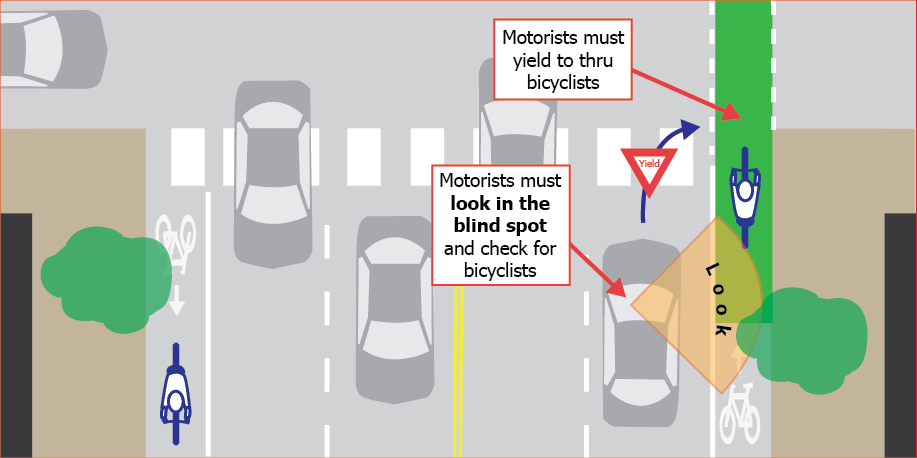 (1) Conflict areas: paint should be use to highlight difficult conflict areas between cyclists and motorists through junction areas. More than four out of five bicycle crashes in Minneapolis occur at intersections (and merge zones)[11]—areas that warrant highlighting from users. Such instances include but are certainly not limited to, the right hook, standard crossings, areas where facilities cut across an auto on-ramp, intersections with protected bike lanes, and other areas where separate bicycle facilities cross roadways (or vice versa). Municipal resources would dictate how many conflict points can be addressed.