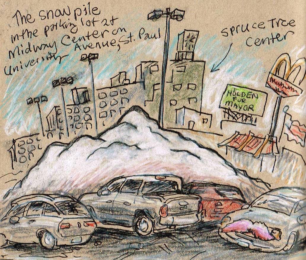 Last week, I sketched a big, dirty snow pile in the middle of the Midway Center parking lot on University Avenue in Saint Paul: