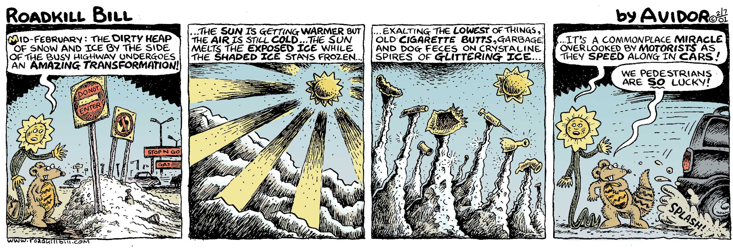 By the end of winter, the piles of snow are sculpted into fantastic shapes by the elements – this comic strip I drew in 2001 explains the process (click on the comic to make it bigger):