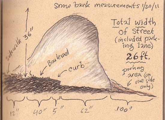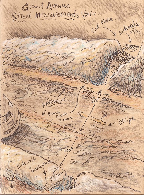 The following annotated sketches detail the glacial proportions of snow and ice that built up on city streets during the winter of 2010-2011: