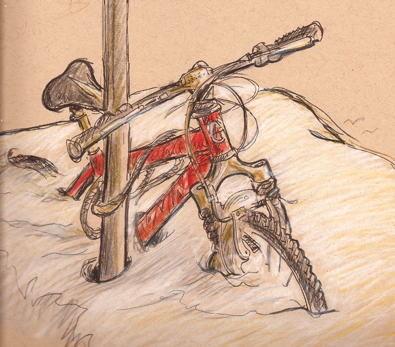 I made the following sketches from inside a coffee shop showing a bicycle trapped in the icy grip of snow pile: