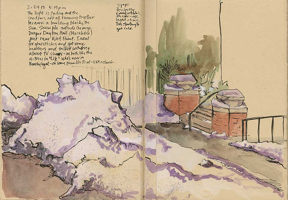 Winter in Minnesota does not favor plein air sketching – ink freezes in pens, watercolors turn to ice and fingers develop frostbite. Fortunately, there are many good places to sketch indoors in the Twin Cities (watch this KARE 11 report about the Metro Sketchers sketching at the Como Conservatory). Towards the end of the season, I get bored of sketching indoors and venture outdoors into the cold. I put on my fingerless gloves and dilute the ink in my fountain pens with alcohol and step outside to sketch the predominant feature of late winter in Minnesota: snow piles. Snow piles are a ubiquitous, though fleeting part of the urban, winter, Twin Cities landscape and every year, a few of us urban sketchers take up the challenge to celebrate and immortalize snow piles on paper before they melt away.