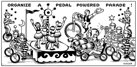Outlandish bicycle designs bring attention to bicycling. Drivers, cyclists and everyone else can’t help but notice a tall-bike, towering above traffic. Some locally made, pedal-powered contraptions have been highlights of the May Day parade and images of them get passed around the internet. I’m thinking of the “summersault bike” or various pedal-powered elevators. A lot of cities have “Art Car” parades. It would be fun if the Twin Cities had an annual “Art Bike” or pedal-powered parade. The Saint Paul Classic and other local bicycle events have a little of this. People create fish-bikes, buffalo-bikes, flamingo-bikes and other stuff but, once a year, it would be nice to get them all in one place.