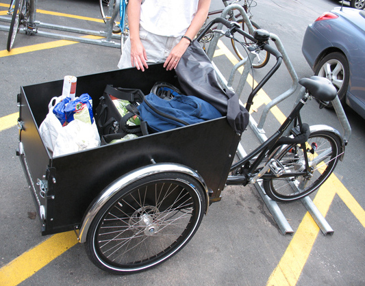 The boxes are made from panels of enameled, marine plywood riveted to an aluminum frame. I’ve had mine for 5 years of fairly heavy use and it’s still going strong. I use it all winter (and summer) to get groceries and run errands, or I ride it for everyday transportation when winter streets are so slick that I don’t trust the studded tires on my regular bike. It can haul 220 pounds in the cargo box. That’s a decent sized adult, multiple kids, groceries, garden supplies, or just about anything else.