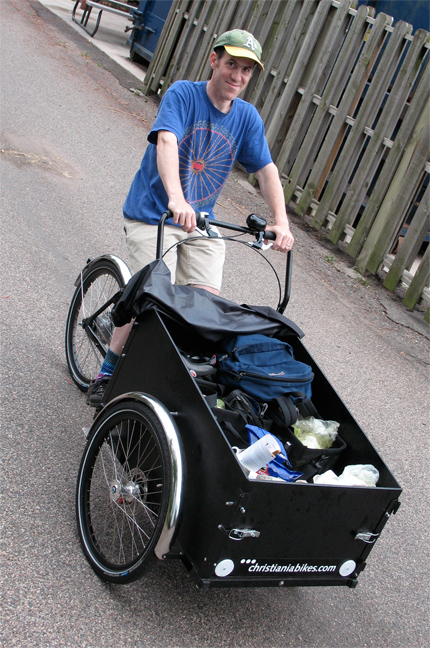 In addition to the outlandish, I’d love to see the Twin Cities devote some energy to more practical bicycle or tricycle designs. Cargo trikes or “Box Trikes” are perfect for Minnesota winters. Their three wheels make them stable on ice and snow. When my wife and I got a house, the first thing I did was get a Christiania Trike from Denmark. In Denmark, at the low-end, they cost between $1400 and $1600 dollars for the basic box trike and a few extras. You can choose a steel or (lighter) aluminum step-through frame, and anywhere from a 3-speed to an 8-speed Shimano internally geared rear hub. They have disk brakes up front and a drum brake in back for quick stopping. You can get a frame lock, different types of removable seats in the box (with seatbelts), and different styles of optional rain covers. There are lots of other optional design features as well, including removable front doors, custom colors, different saddles, etc..