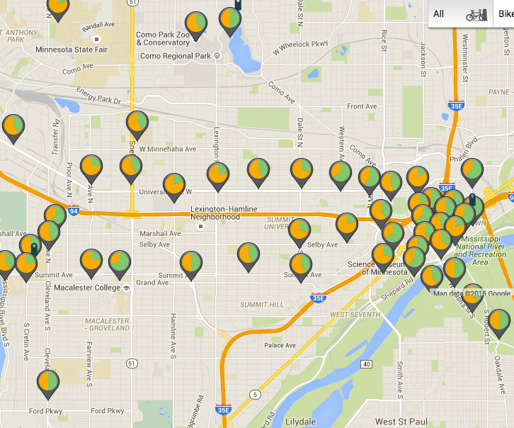 Nice Ride stations on University Avenue are not utilized by bike riders if the bike riders can’t get to their homes with a nearby station dropoff for their bike. There are no stations north of University Ave except at Hamline University on Snelling Ave, Sherburne Ave (1 block north of the LRT station), and Como Park (2 locations).