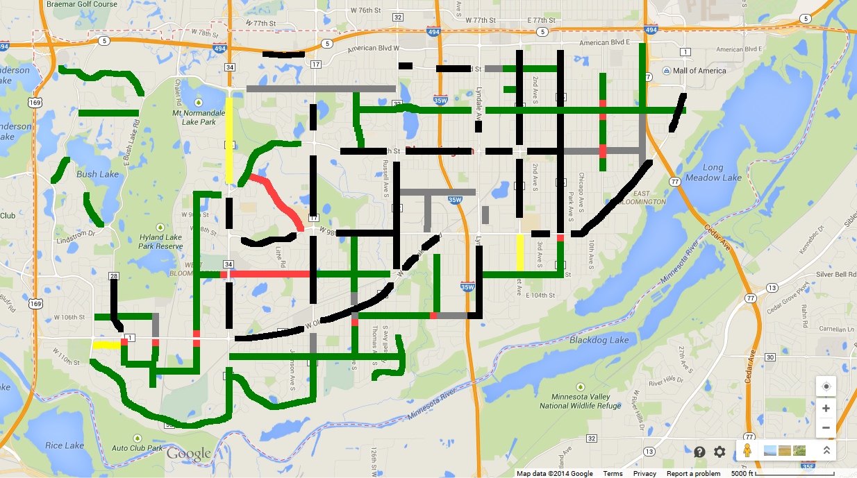 Thinking of Bloomington as a whole for a minute, the four-lane death roads all get road dieted, except for Old Shakopee Road west of the freeway which gets a five lane section. (Traffic counts are above 20,000 for most of it, due to Hyland Park limiting east-west options). The Lyndale Avenue cycletracks go from the new bicycle crossing at the Minnesota River bridge (which is going to get replaced sooner or later, and it looks like sooner), to the 86th Street bicycle lanes, the 98th Street cycletracks go to at least the new Nokomis-Minnesota River Regional Trail and the under reconstruction Old Cedar Avenue bridge along the newly road-dieted section.