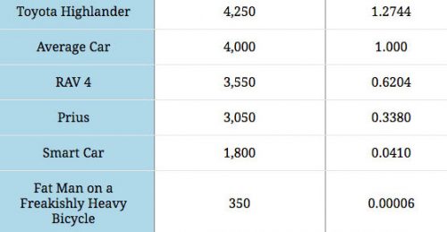 Via Pedal Fort Collins, here’s a simple chart showing the basic relationship between vehicle weight and the amount of “damage” or wear that is caused to the roadway. The relationship is pretty straightforward, but thanks to the magic of gasoline, people often forget to think about the weight disparities on our roads. Thus the chart, where … Continue reading Chart of the Day: Vehicle Weight vs Road Damage Levels