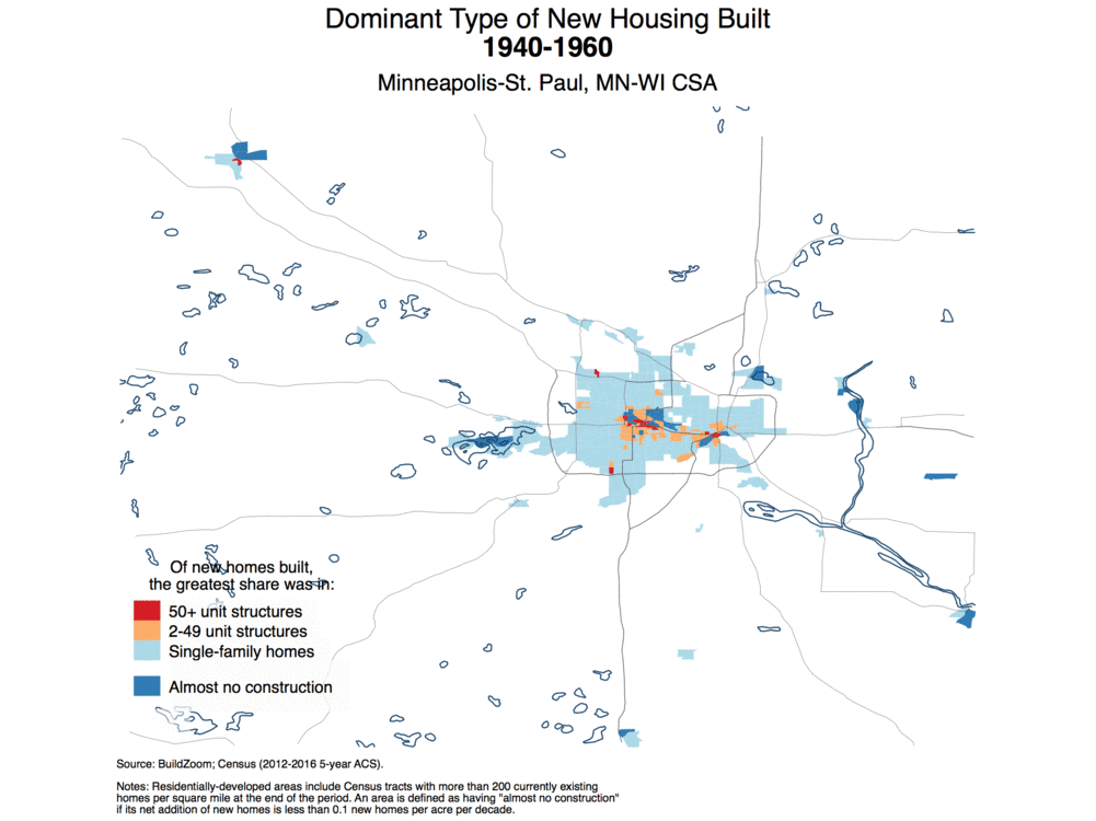 The following map colors the residentially developed footprint of the Los Angeles metro area as of 1960 according to the dominant type of new housing built there during the 1940s and ‘50s. It distinguishes between single-family homes in light blue, 2 to 49 unit structures in orange, and 50+ unit structures in red, and assigns each Census tract a color based on the type of housing that accounted for the most new homes during the period.