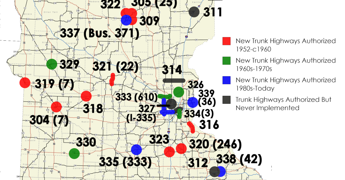 If a lot of the 1934 routes were near worthless, this second wave as a whole was even worse. I previously have called these the “pork barrel routes” in discussions with other roadgeeks online, but the problem is that highway projects as political plums for local politicians rather than transportation merit (as well as politicians thinking they’re highway engineers) happened both before and after this. So it’s unfair to single these out, even if they’re the most obvious and egregious examples in Minnesota. Here’s a map with the legislative route number noted.