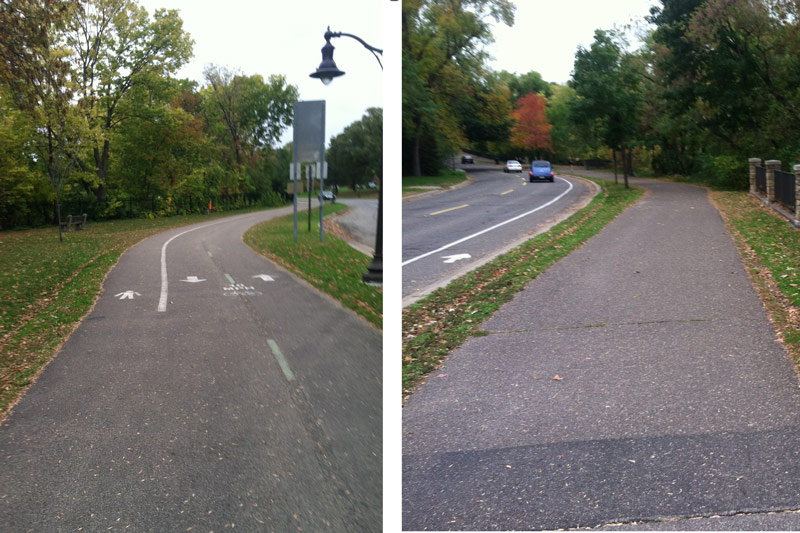 - Minneapolis’ marked versus unmarked multi-use bike / jogging paths (e.g. the River Road) vs. Saint Paul’s nothingness