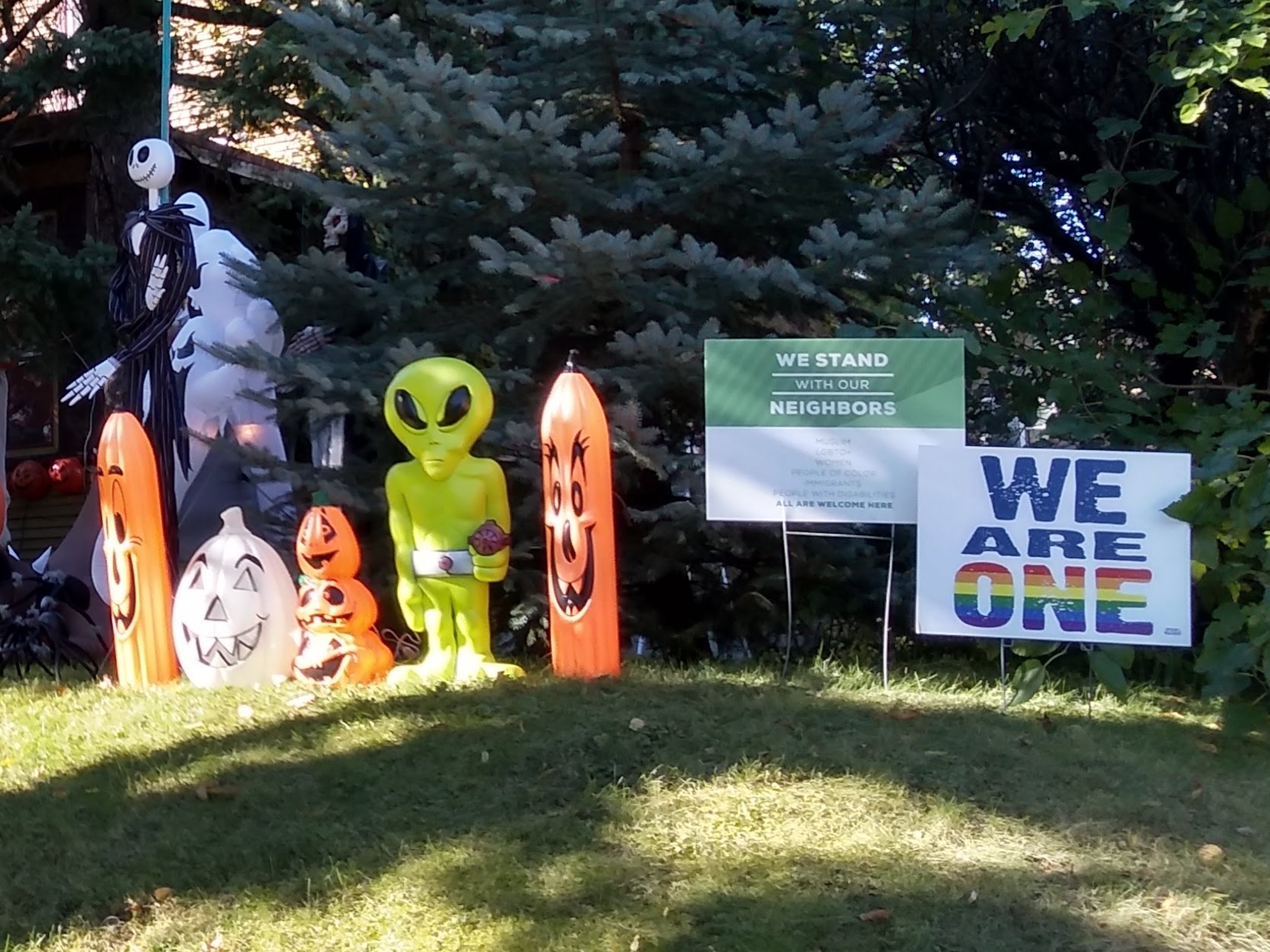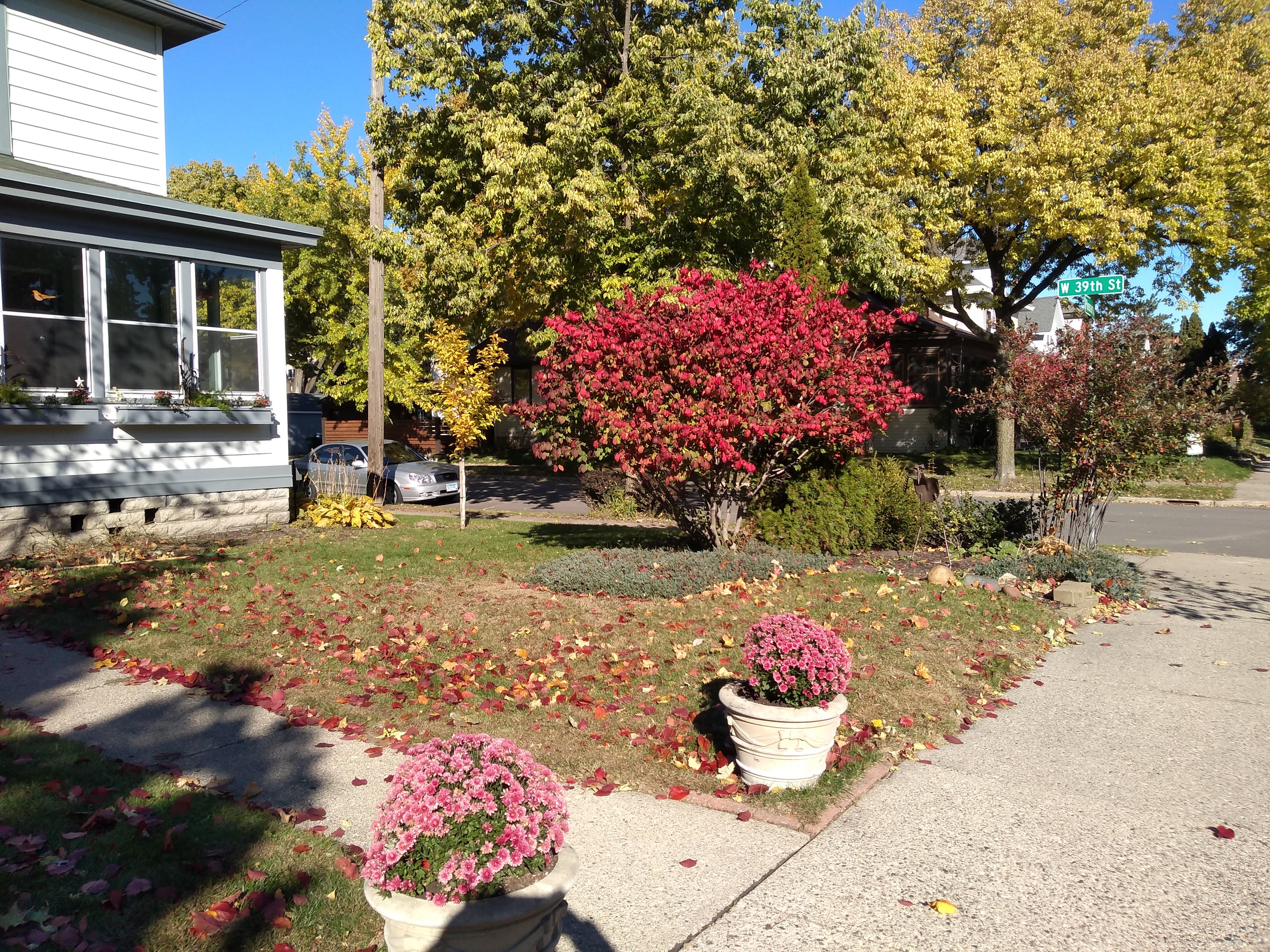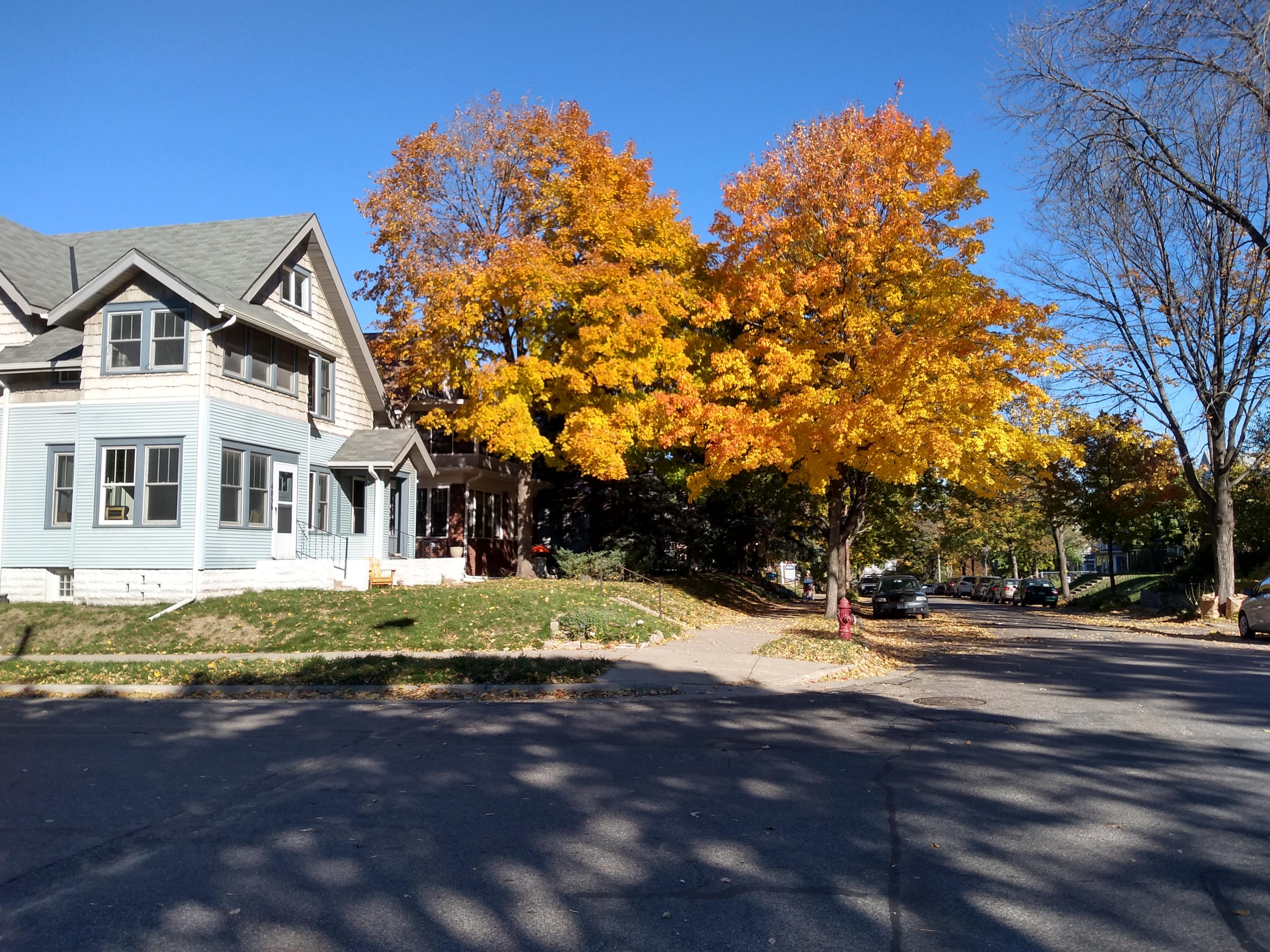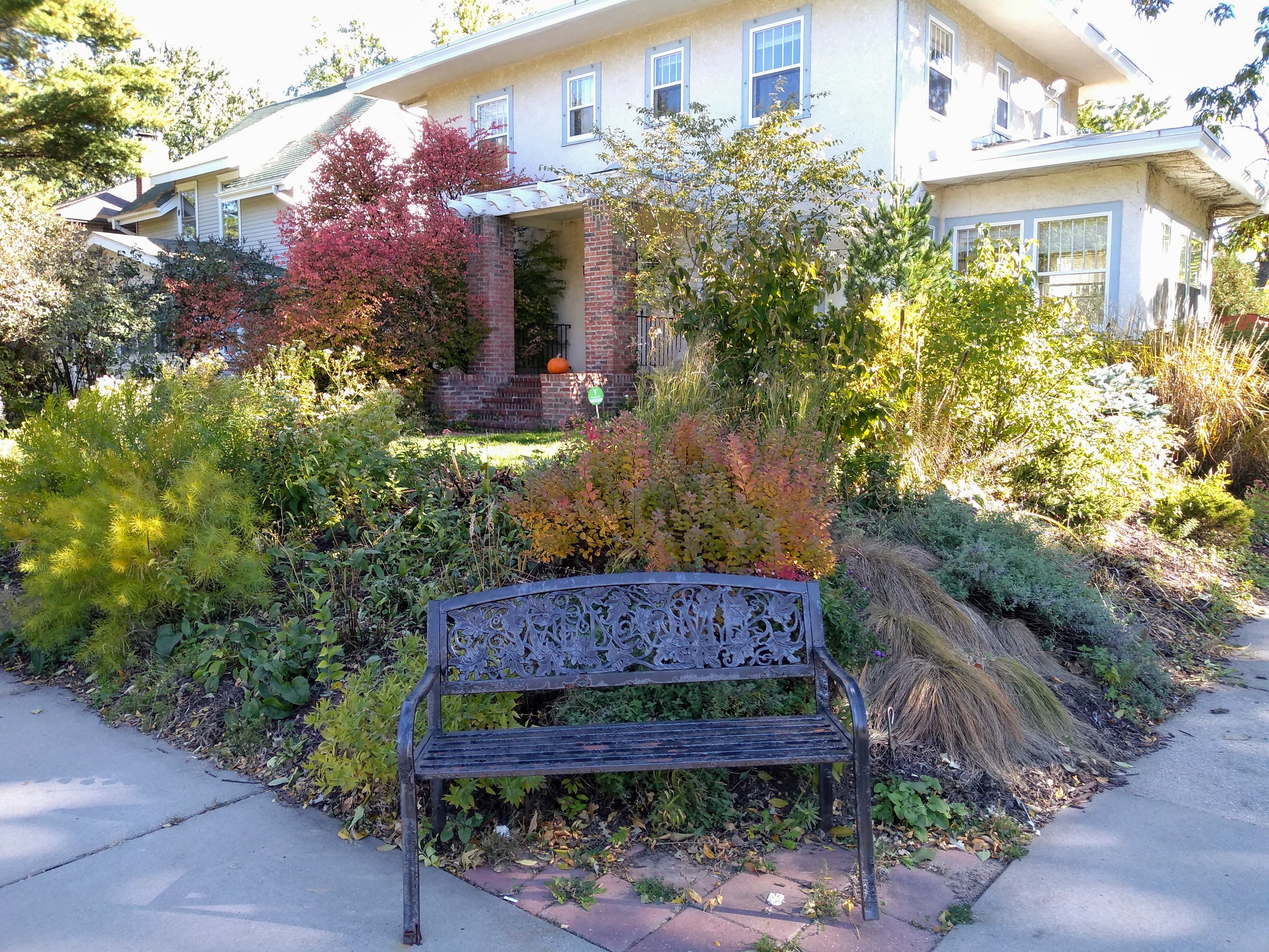 I took Pillsbury Avenue north only as far as 40th Street, where there is a discontinuity in the street grid. At that point I turned west on 40th to Lyndale, where I did a southward spur to 41st. Among the sights along the way were more autumn foliage, a seasonal display of solidarity, and a corner bench with a lush backdrop.