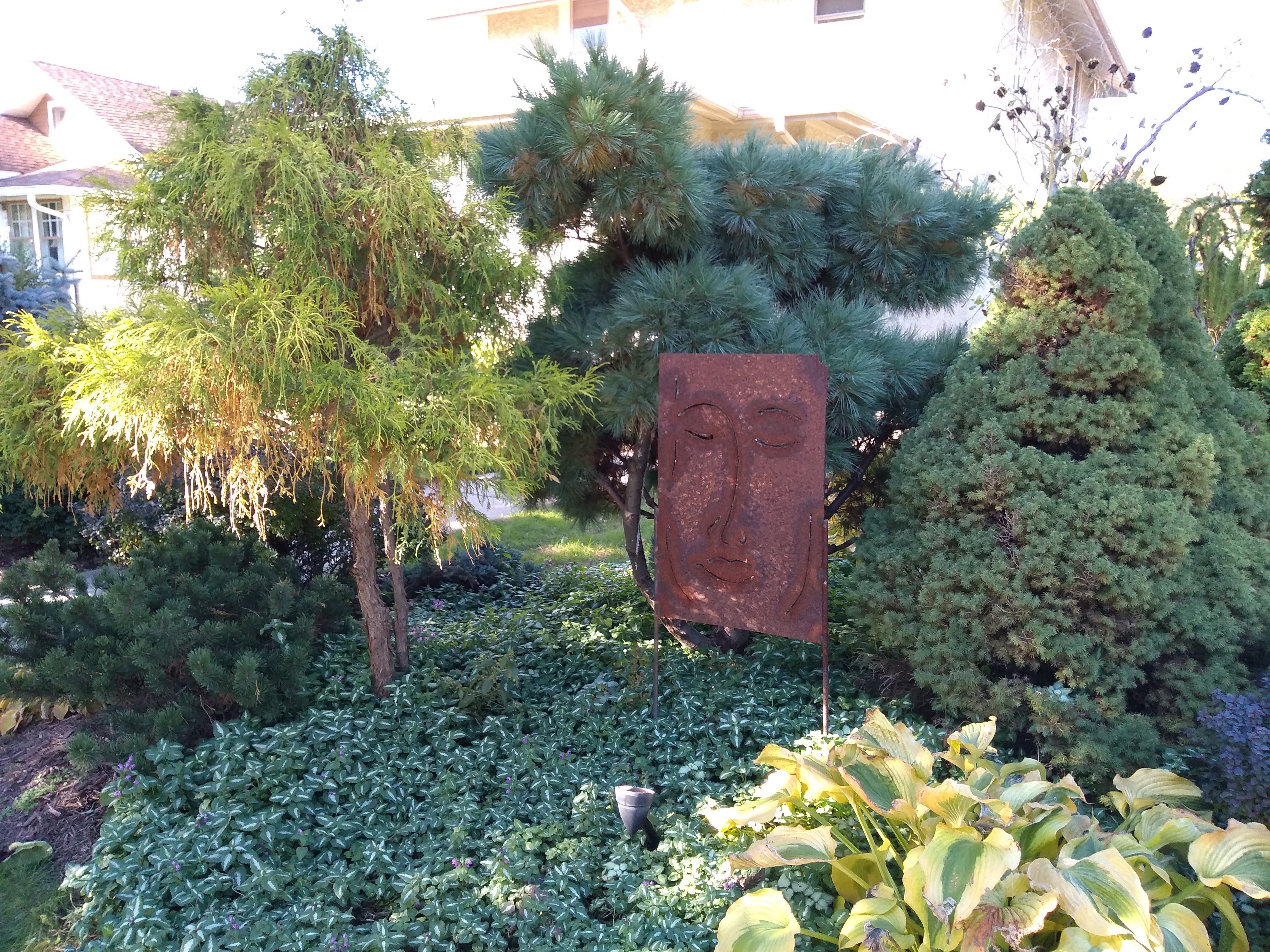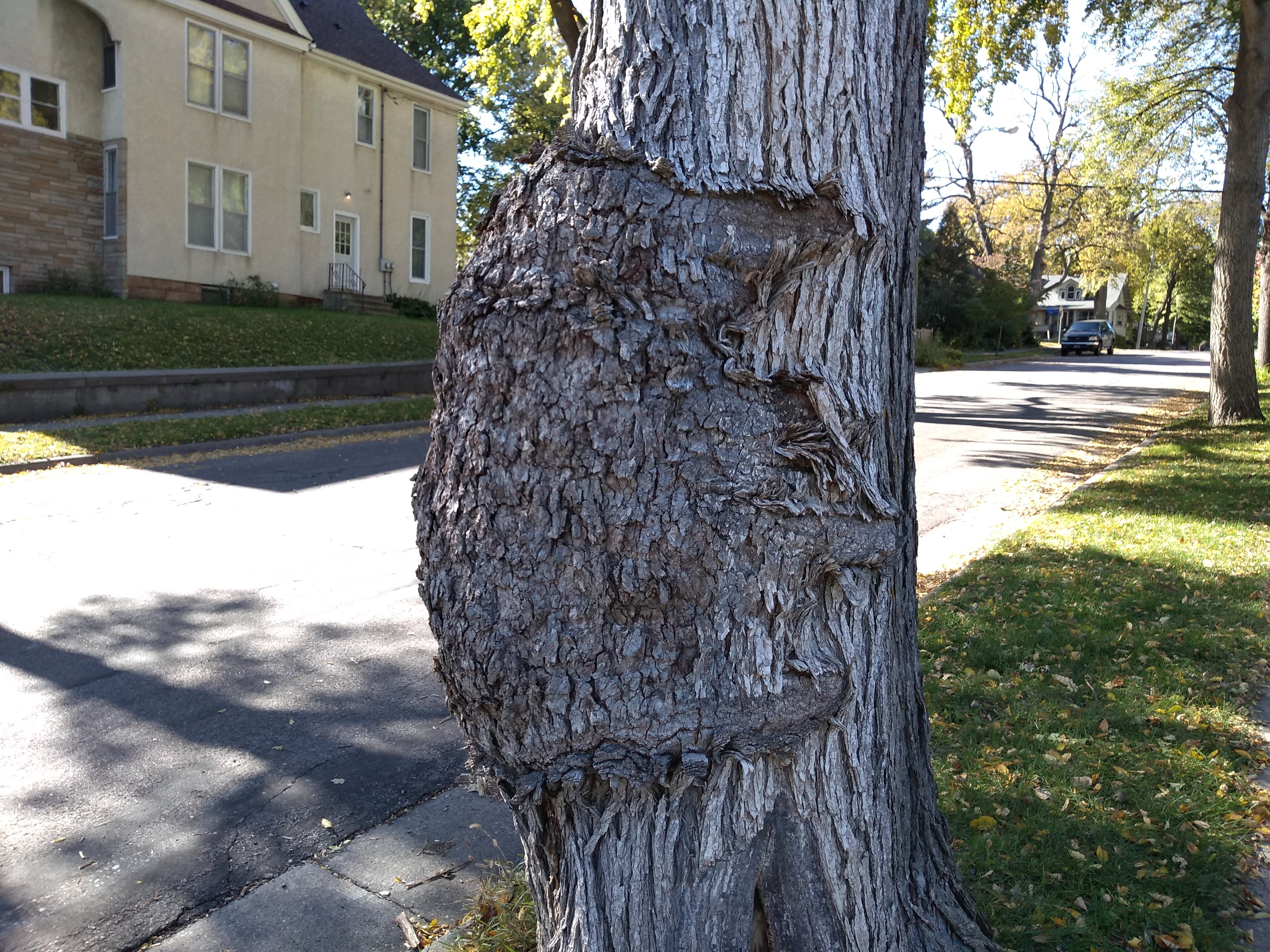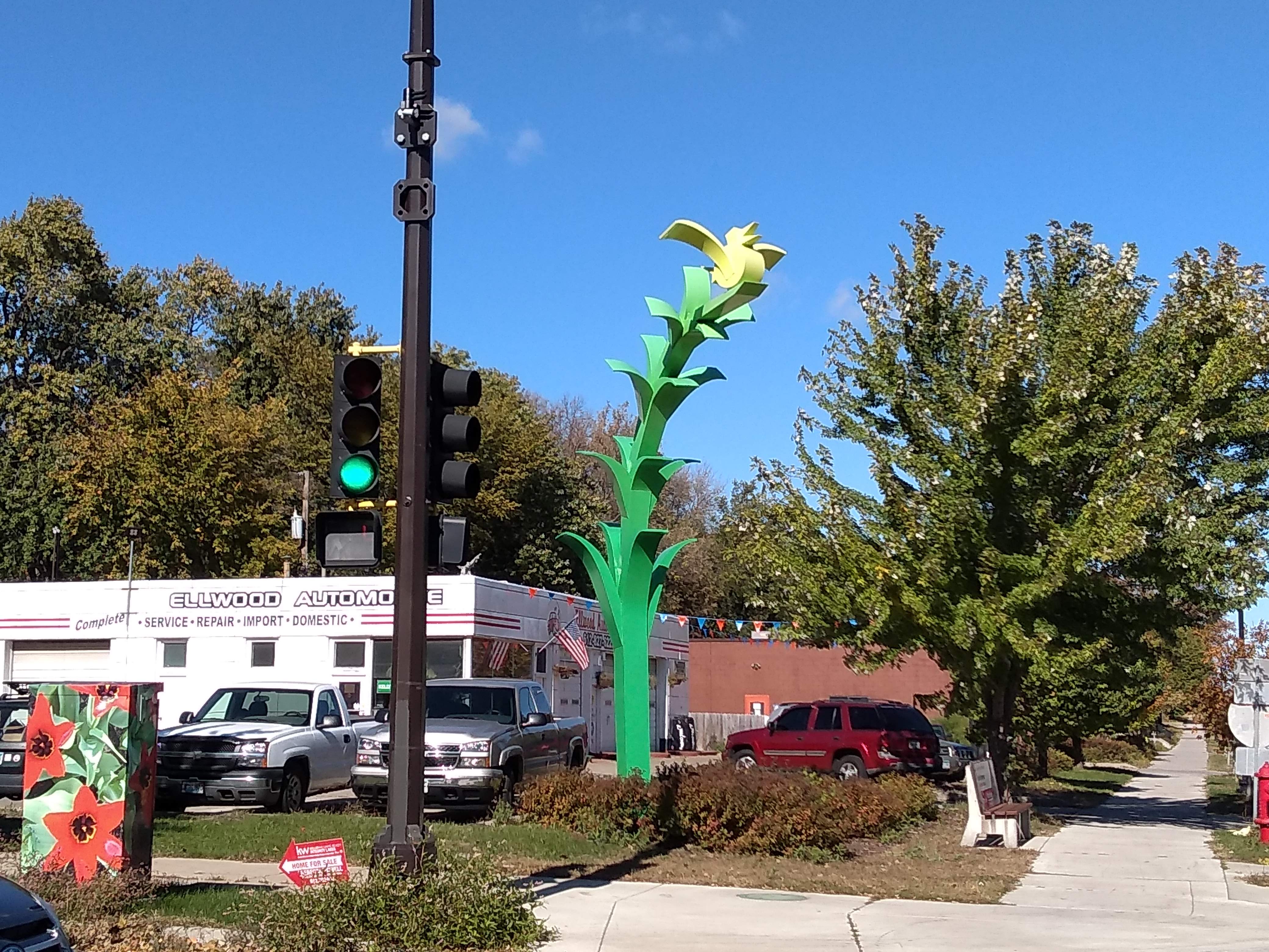 My northward journey ended at 40th Street, where I turned back to 41st before heading west. Each of these two corners presented an interesting sight, one a public artwork, the other a quirk of nature. The 40th Street gateway sculpture is part of the larger Birds of a Different Feather installation created by Ben Janssens, Marjorie Pitz, and Lori Greene, as I described in the prior episode. I’m again grateful for their permission to photograph their work.