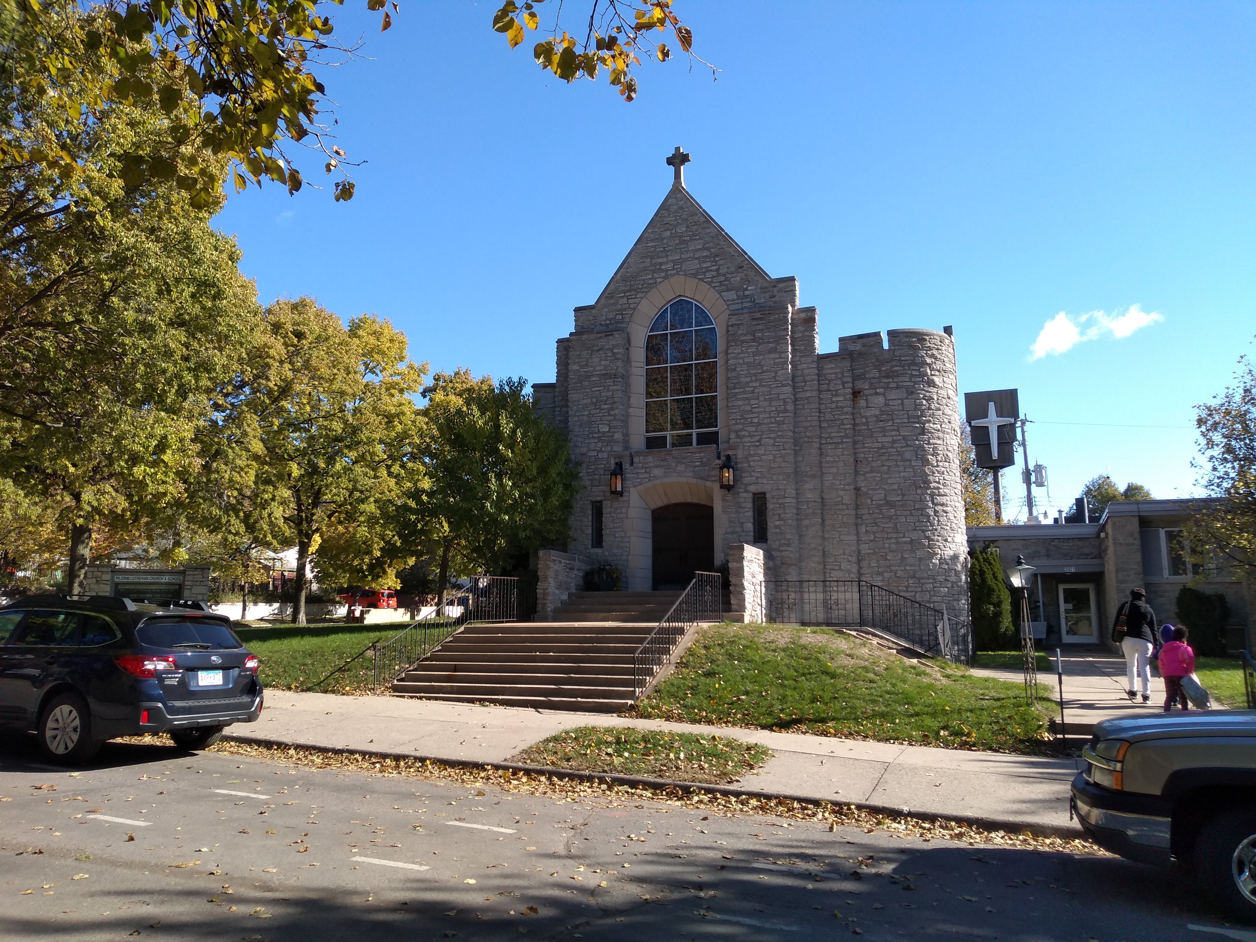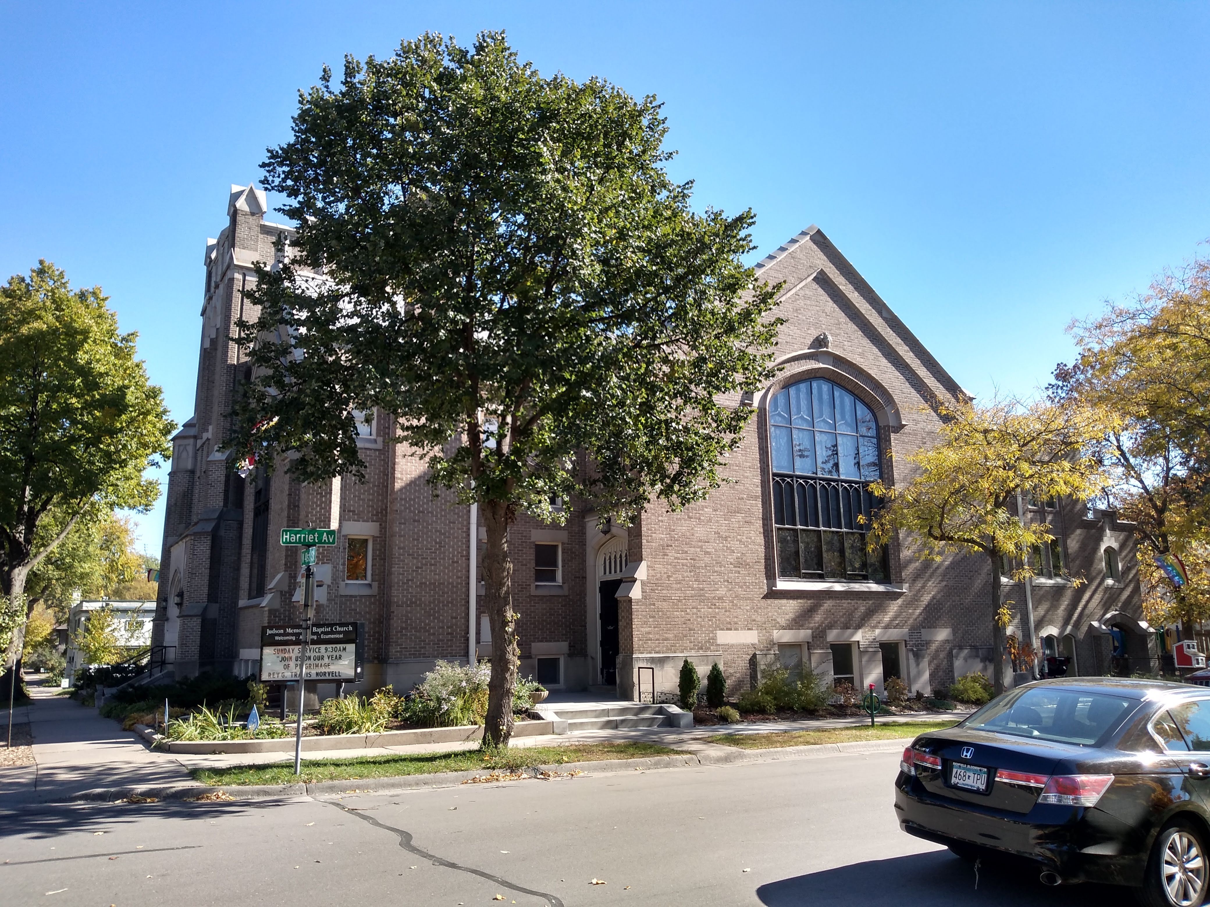 Once I got done enjoying Wentworth (foliage and all) and turned back onto 41st Street, I was able to go several blocks without stopping for a photo. That ended at the intersection with Harriet Avenue, home to Judson Memorial Baptist Church. Tom Balcom has written a brief history of the church, including the likely origin of its name.