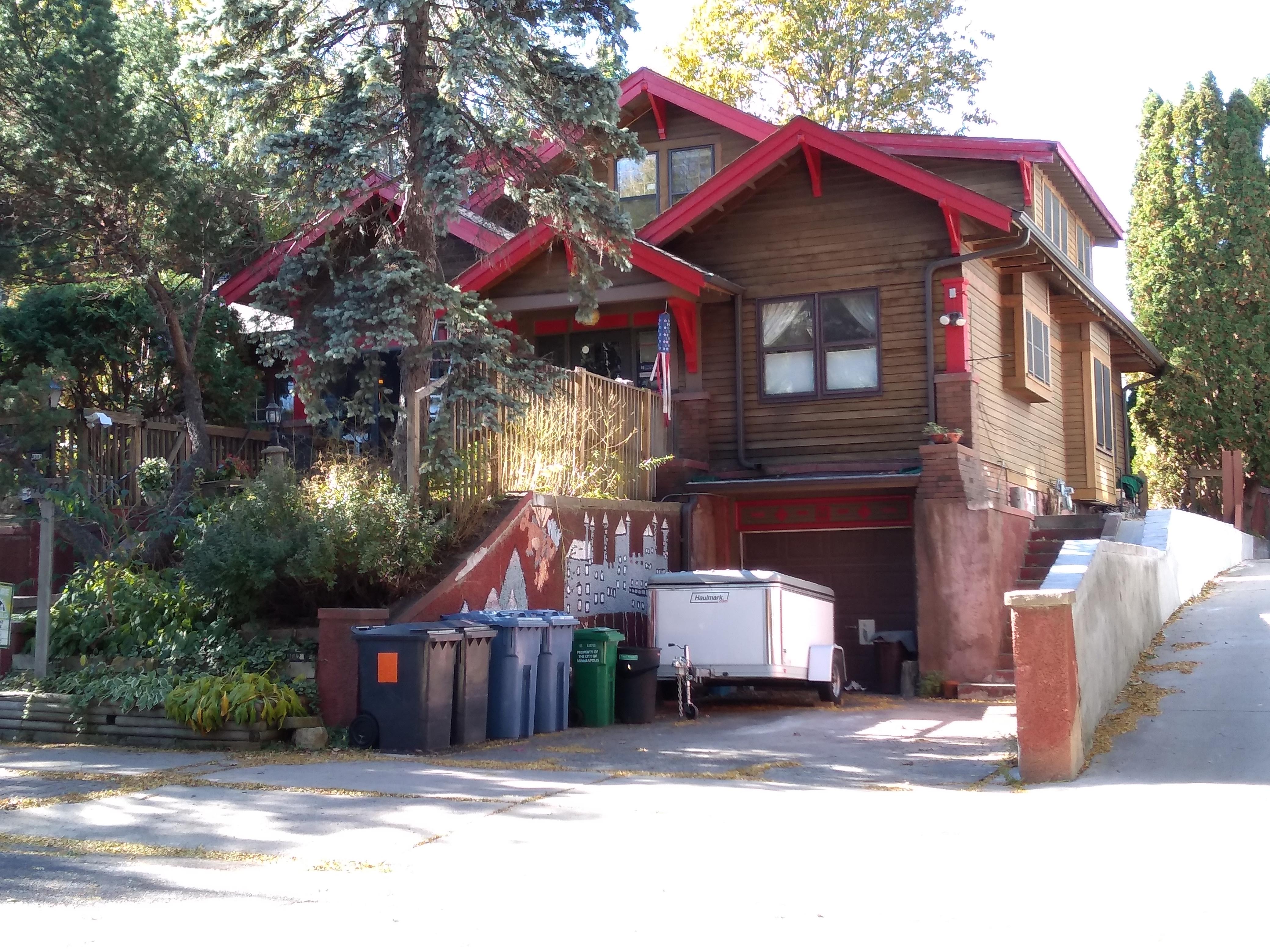 Indeed, I had scarcely turned northward on Wentworth Avenue when one of the houses caught my eye. Something about its playful details told me this was a house with a story. Take, for example, the fantasy castle painted on the retaining wall to the left of the driveway. Sure enough, a bit of online search reveals that this house was until recently the long-running family child care home operated by Michael Kauper and the late Marian Turner. Their home was recognized both as “a nurturing place for children” and as the site of “hundreds of kid-friendly science experiments.”