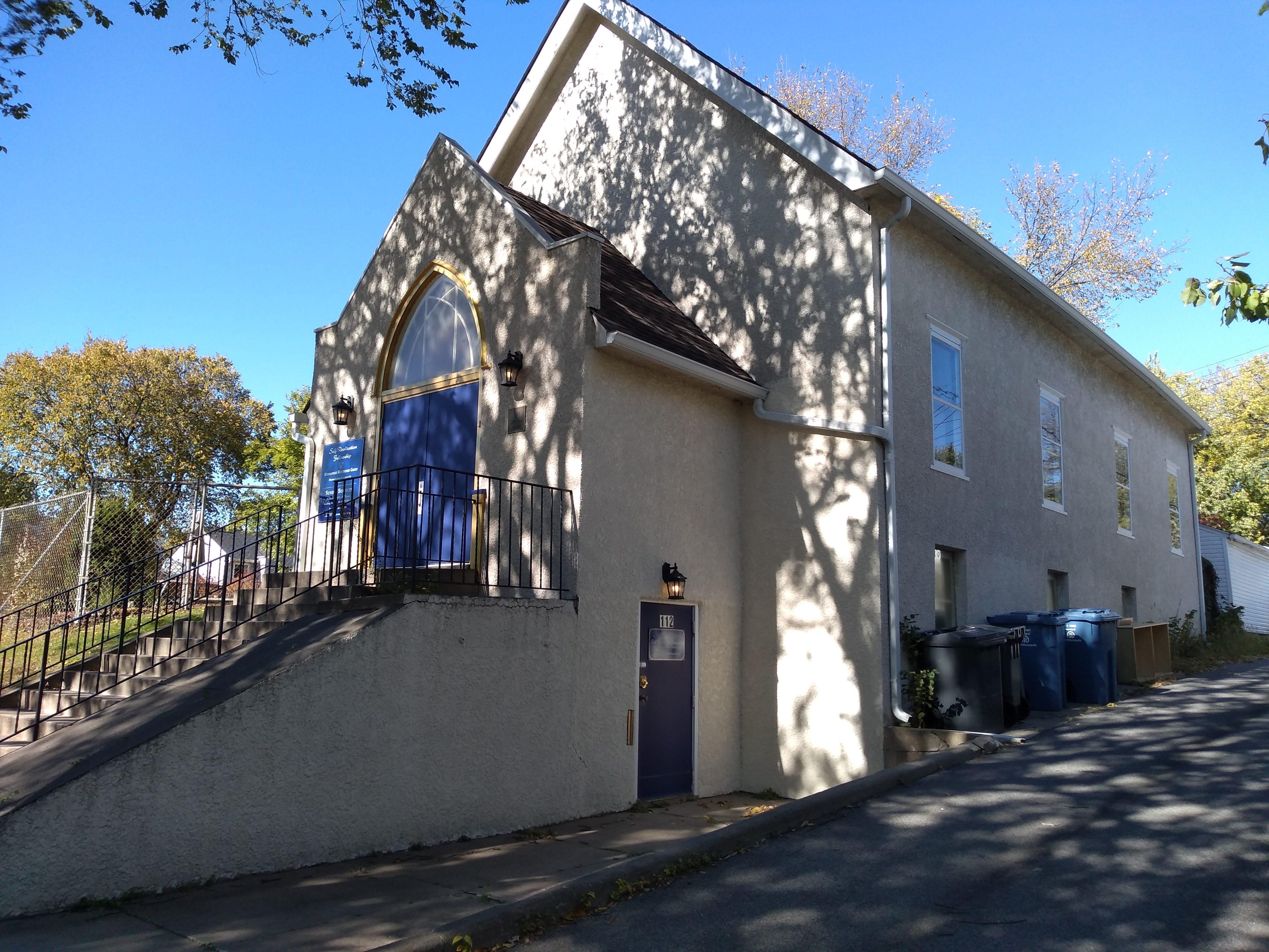 At the southern end of this loop, on 43rd Street between Blaisdell and Wentworth Avenues, I passed another church building, built in 1916 for the Old Apostolic Lutheran Church. The last church it housed was the Primera Iglesia Evangelical, and now it holds the Minneapolis Meditation Group of Self-Realization Fellowship (SRF).