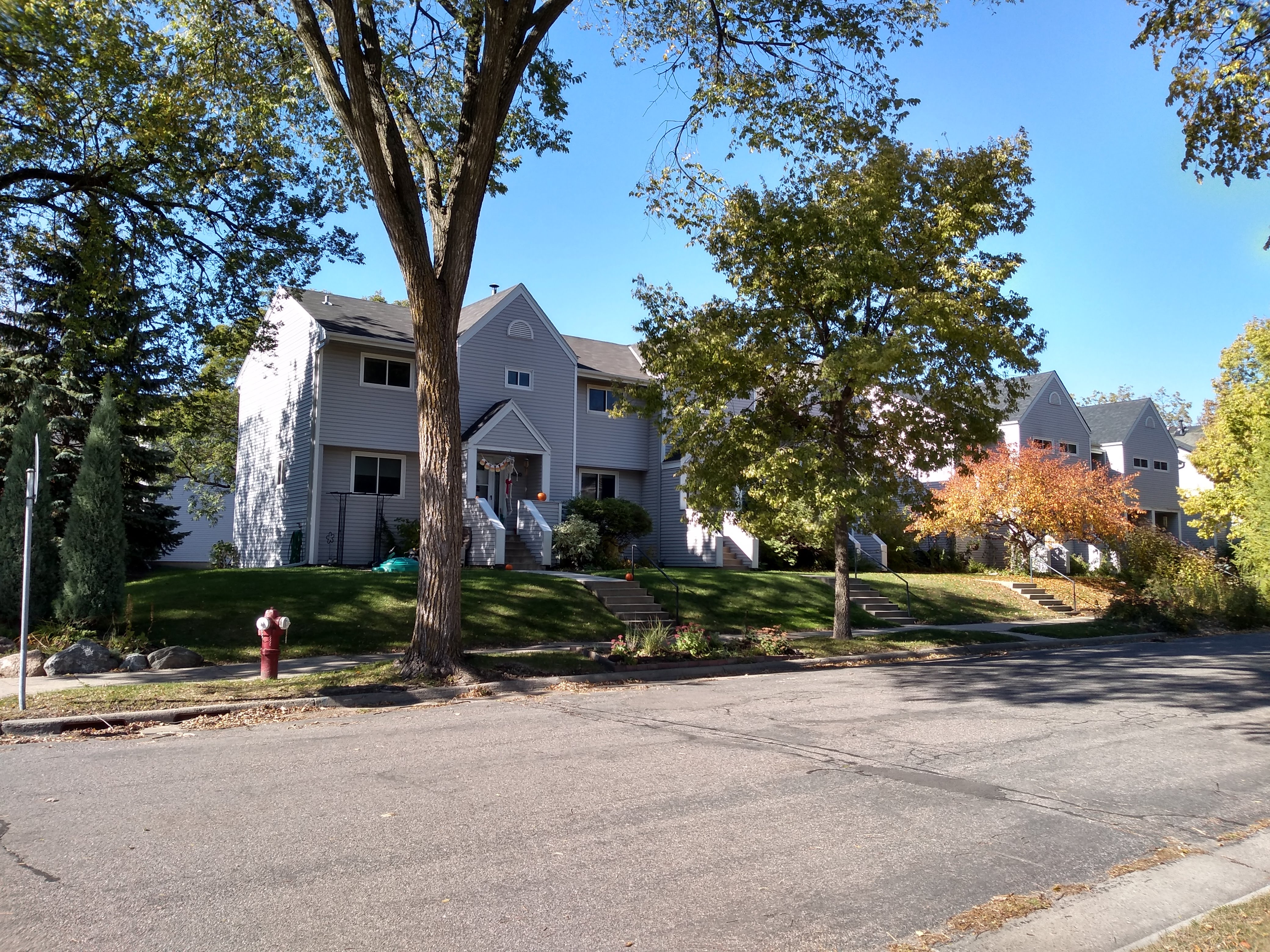 As I turned back onto Wentworth, I got a second look at a cluster of townhomes I’d previously seen from Pillsbury Avenue early in the walk. As with the cluster I’d seen the previous day in the 3700 blocks of Garfield and Harriet Avenues, the buildings are grouped along the adjacent sides of two avenues, taking up the entire southern half of the block. (Here it is the east side of Pillsbury and the west side of Wentworth, in the southern half of the 4200 block.) Just as with that other cluster, the land for these townhomes previously held a school, in this case Rosedale.