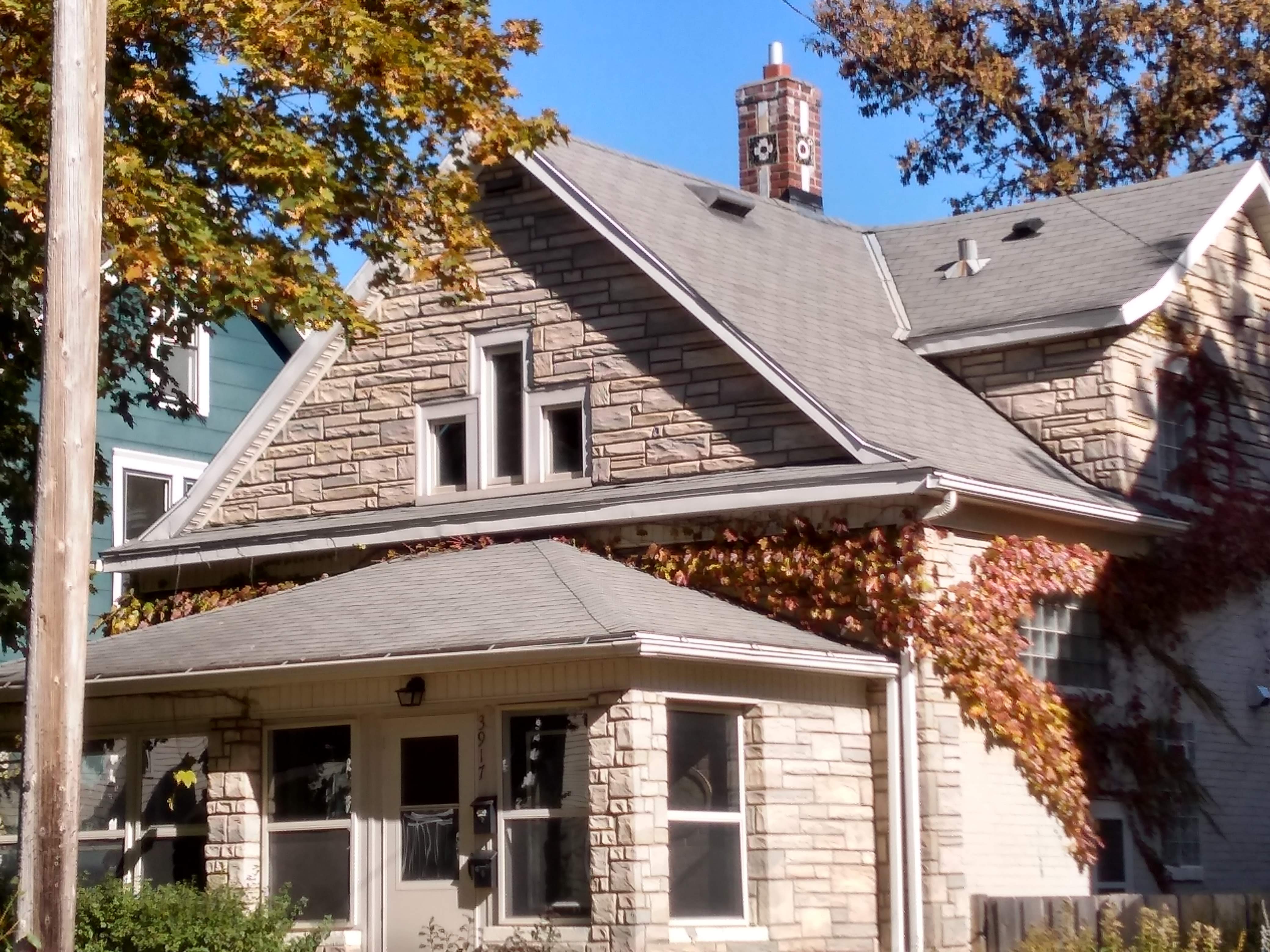 On Garfield, my walking companion pointed out an incongruous detail in one house, a stylistic anachronism. The facade has the fake stone that was popular from the 1930s through 1950s, whereas the chimney has some tile that looks older. According to the index of building permits, the house was constructed in 1905 and received a large addition in 1941. (The addition is in the back, not visible in the photo.) So my theory is that at the time of the addition, the facade was resided in keeping with 1941 fashion and to harmonize with the new portion, but the chimney was left alone.