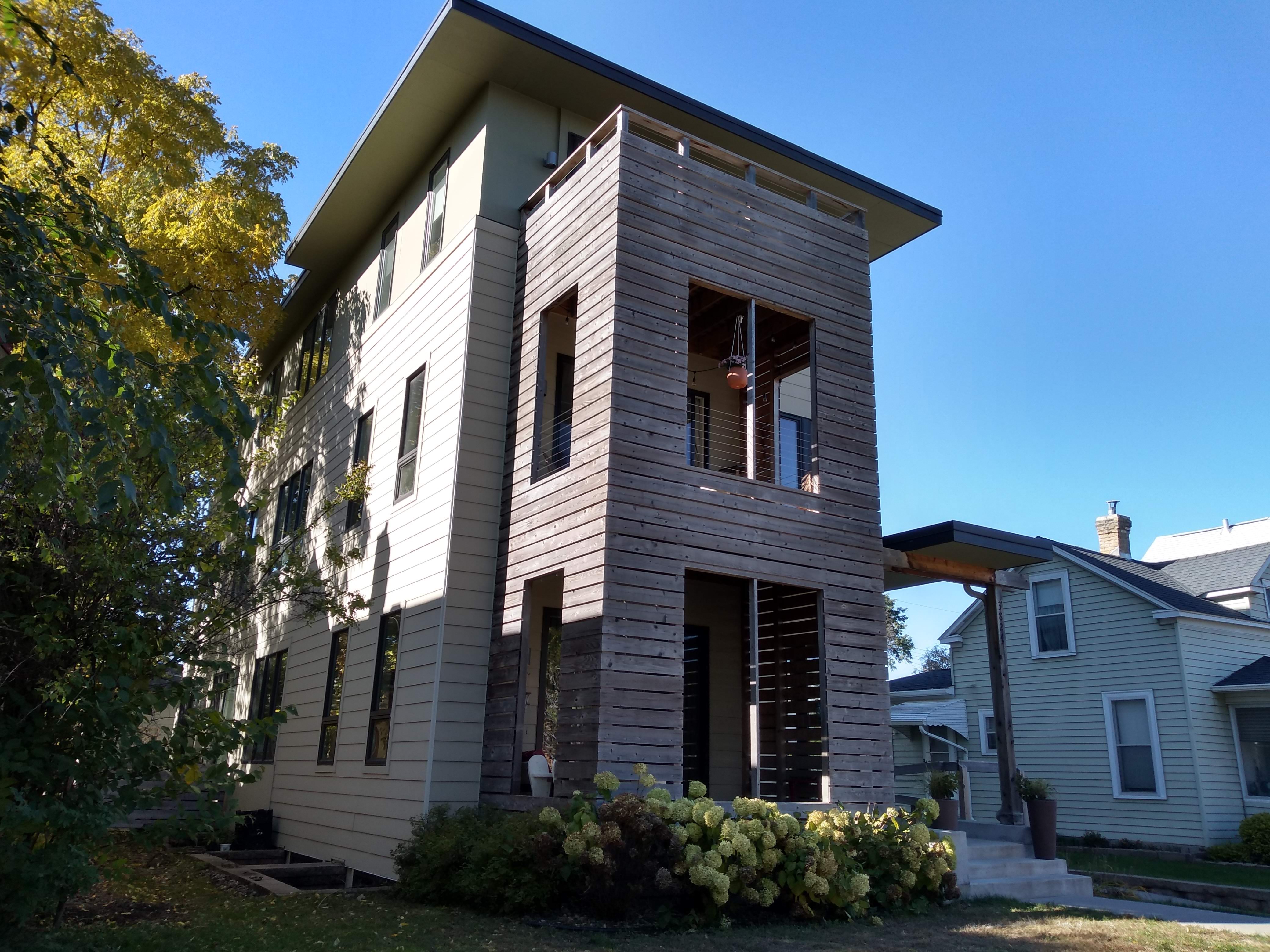 Finally, just as I was almost back to the 38th and Grand commercial node, I spotted a four-plex that stands out from the others on the street (of which there are several) not only for its recent construction but also for its contemporary styling. I was interested to read that this project was supported by the neighborhood association: “KFNA [the Kingfield Neighborhood Association] supports an increase of density and diversity of housing in the neighborhood — especially along transportation corridors.”