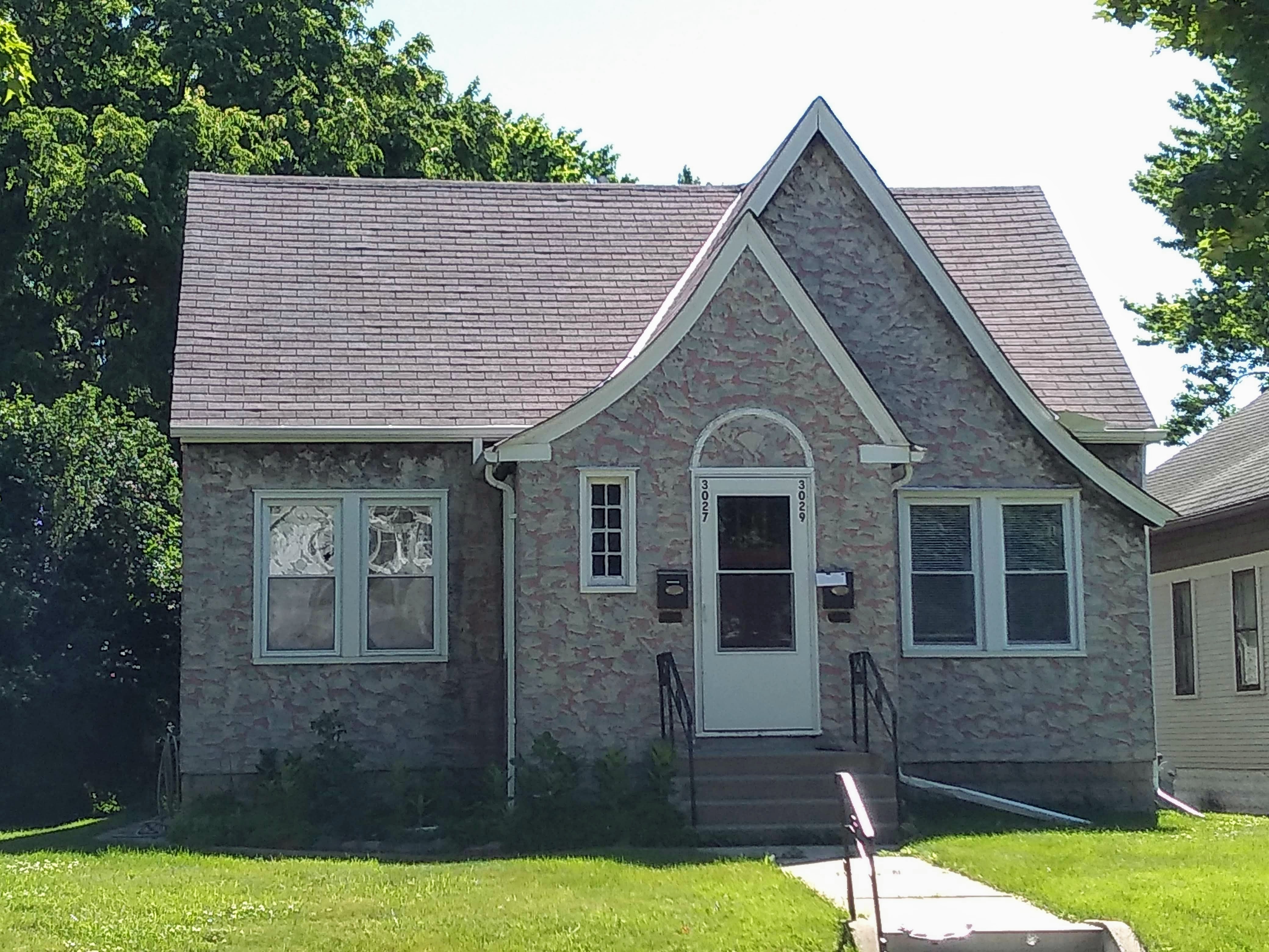 Heading south on 31st Avenue, my companion and I quickly left behind Lake Street’s commercial area (an auto service shop) and entered a residential area. As on the prior day, I didn’t take many photos of residences, but I did make one exception in the very first block. This duplex cottage from 1929 stood out because of the usual way its stucco finish is given large-scale texture through the use of color, rather than merely through troweling.