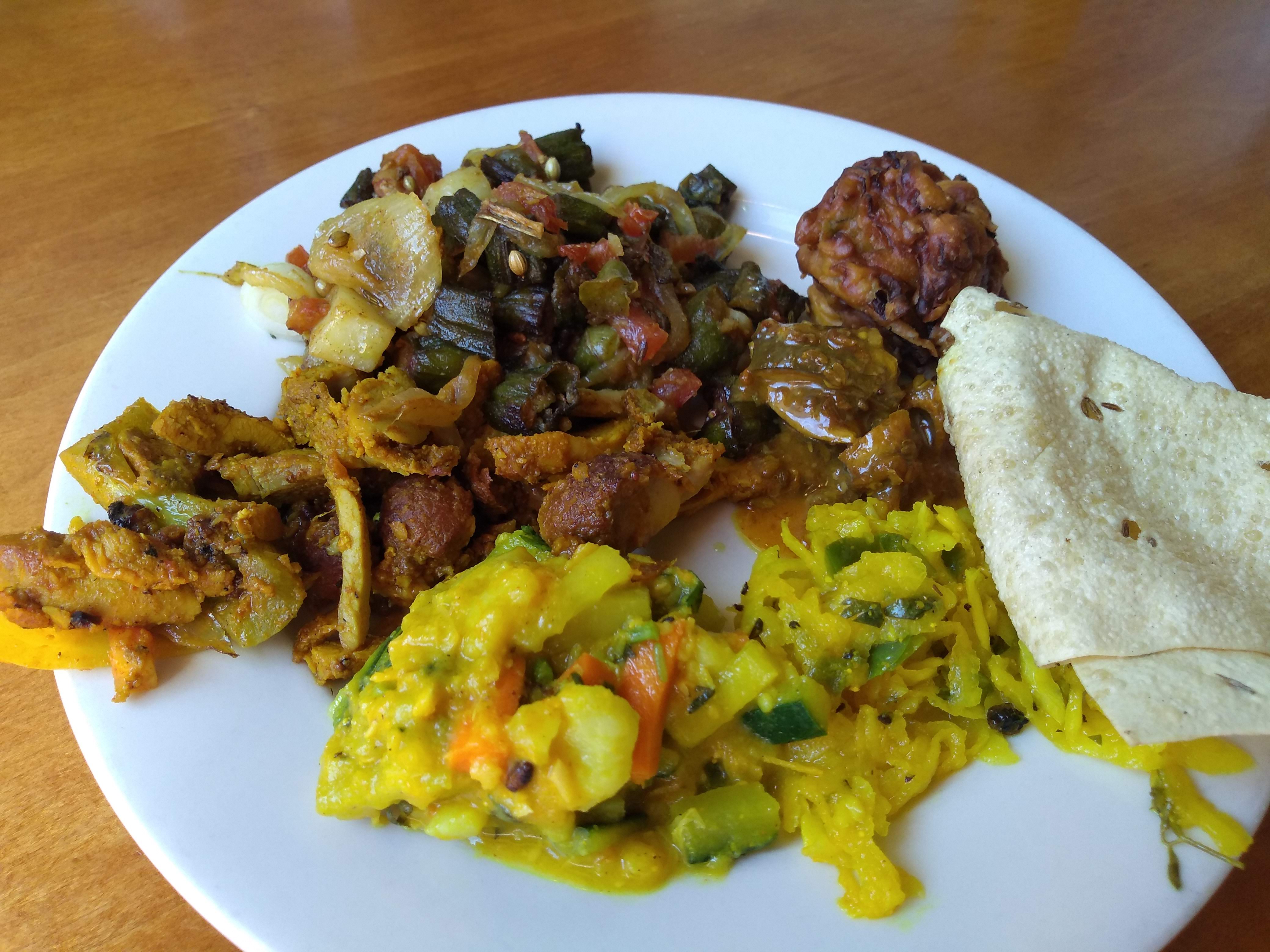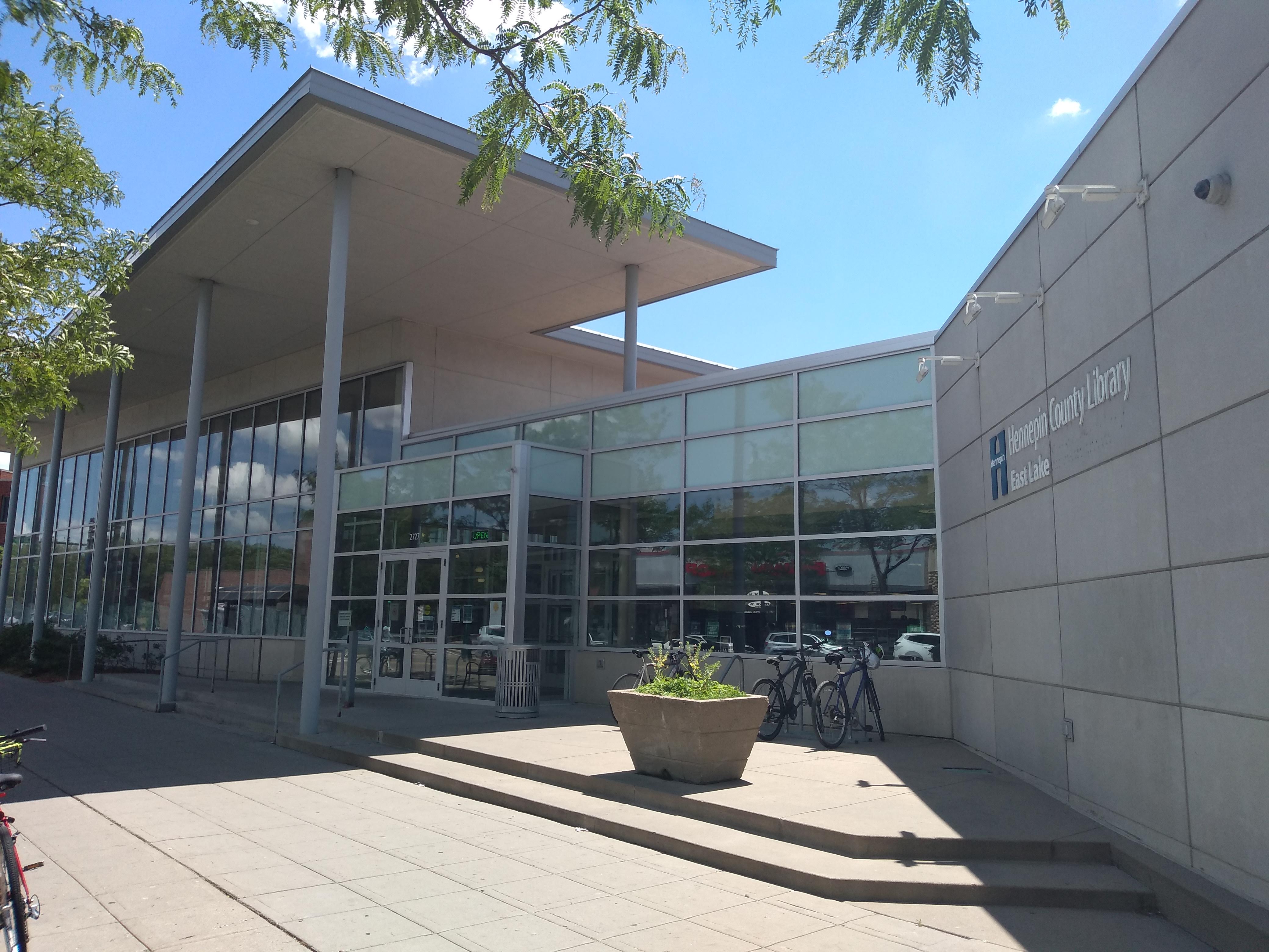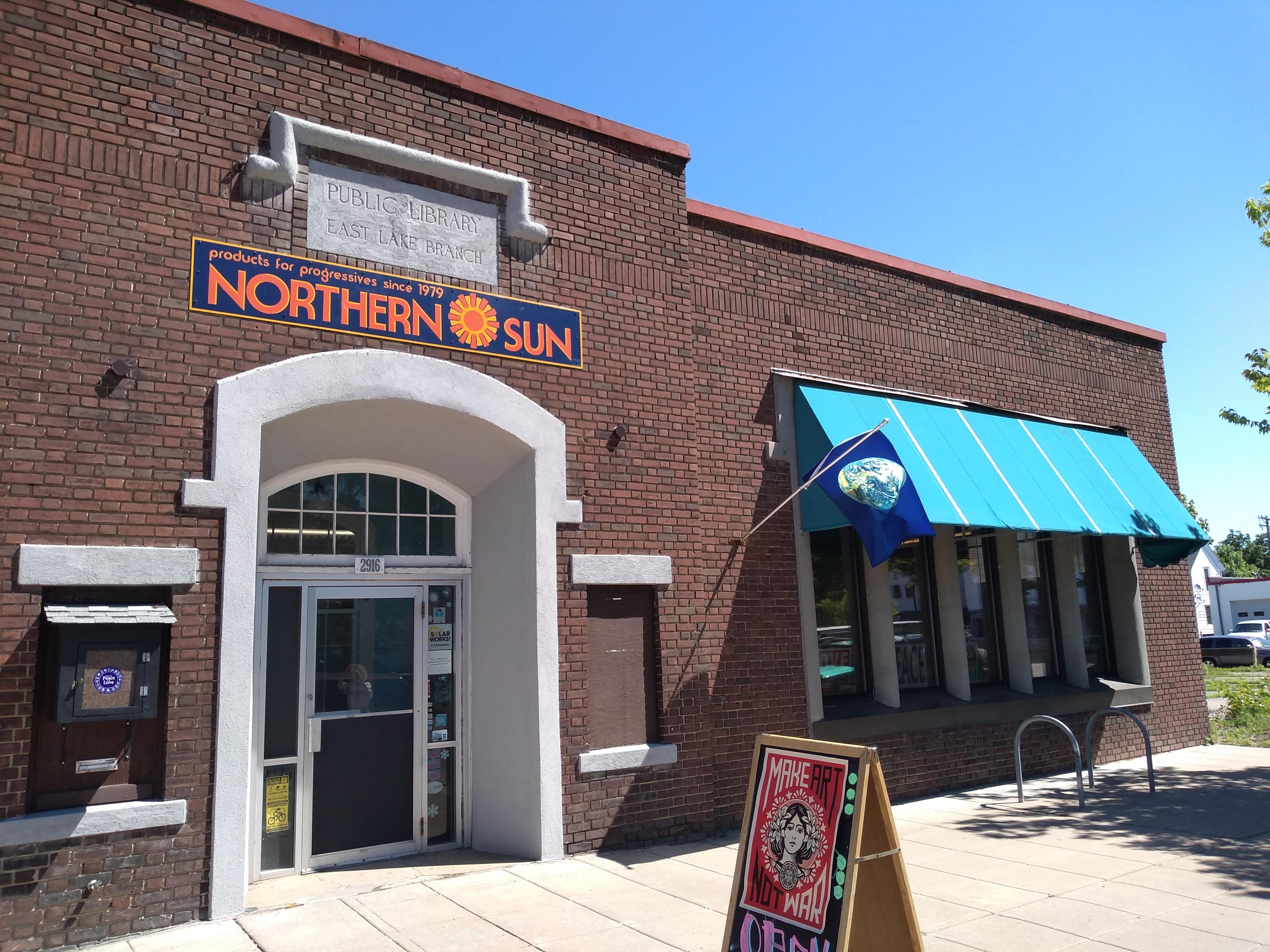 Once back at Lake Street, we crossed to the north side for a block, notwithstanding a route specifically designed to obviate any crossings. Obviously there was something worth crossing for. First, we were able to get a closer view of the former East Lake Library (1924–1976), now home to Northern Sun, selling “products for progressives since 1979.” Second—and more significantly—we got close enough to Himalayan Restaurant to not just see it but go in and sample the lunch buffet’s offerings. Of the items shown, the ram-toria-aaloo (fried okra and potatoes seasoned with Nepalese spices) at the top left of the plate was my favorite.