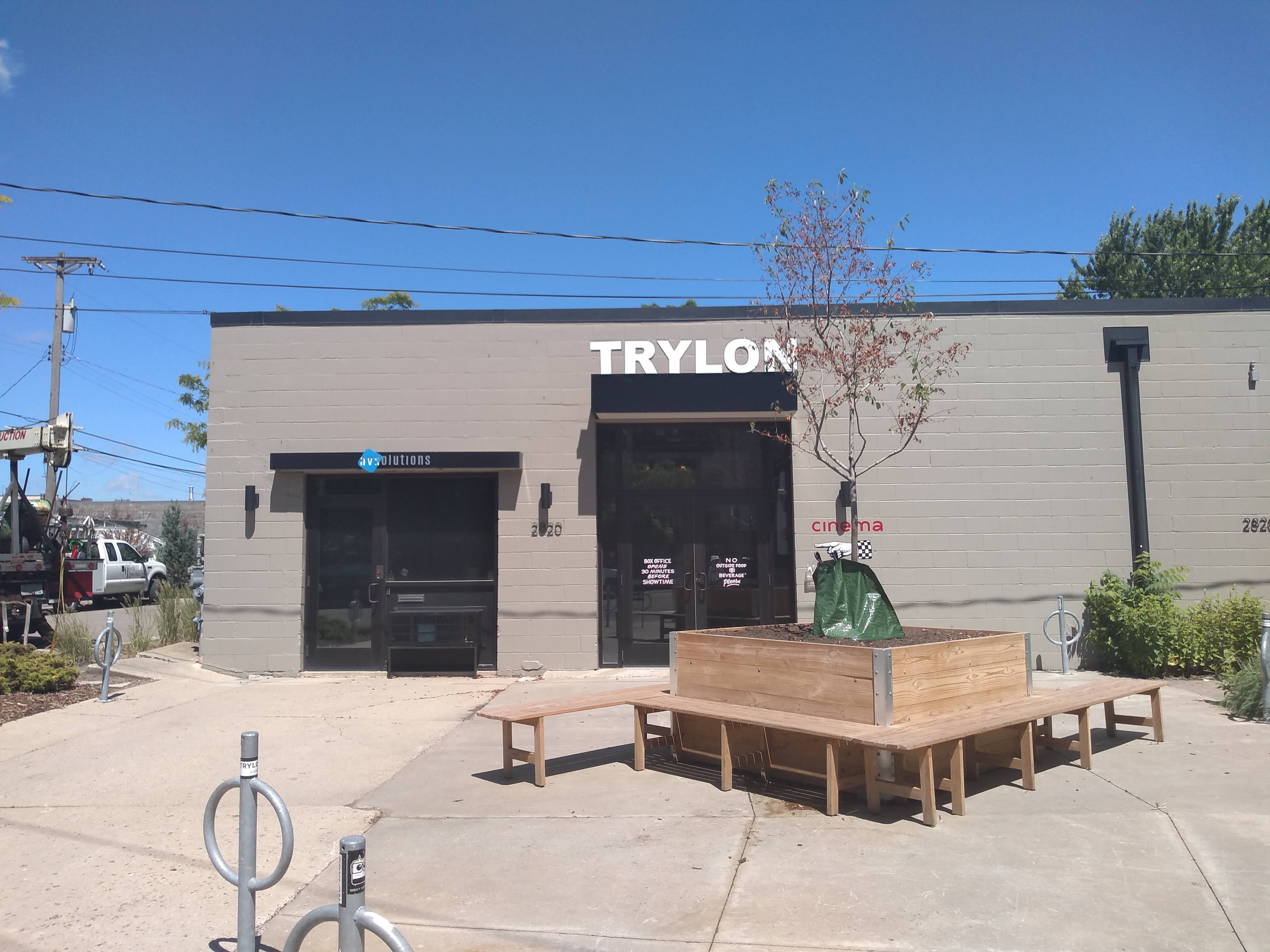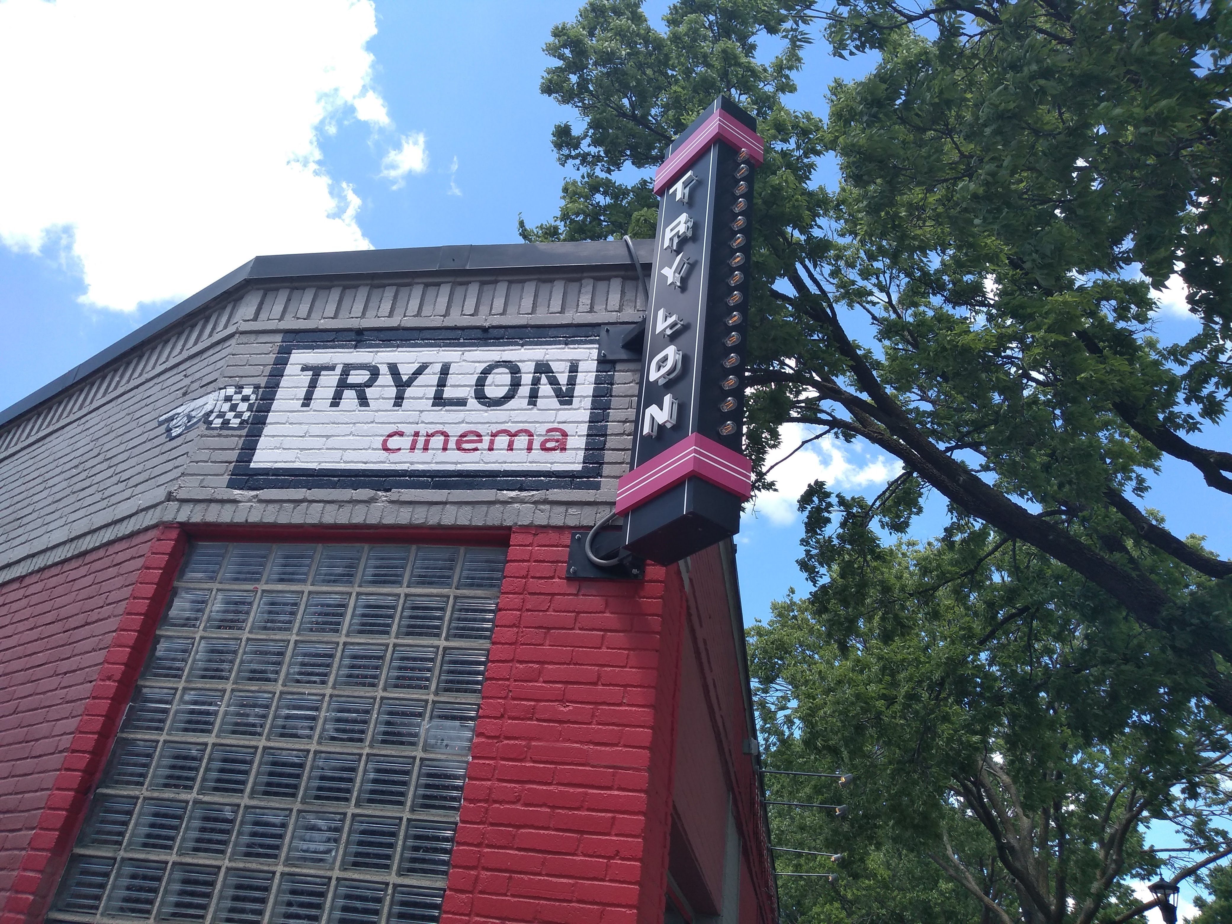 After we crossed Minnehaha Avenue, the building on the corner revealed an interesting sign to supplement the more visible markings of the Peace Coffee shop. As with signs noted on the prior day, this is Phil Vandervaart’s handiwork, the first of a succession that lead down the street and around the back corner of the building to where a newer concrete-block addition houses Trylon Cinema, operated by the nonprofit Take-Up Productions.