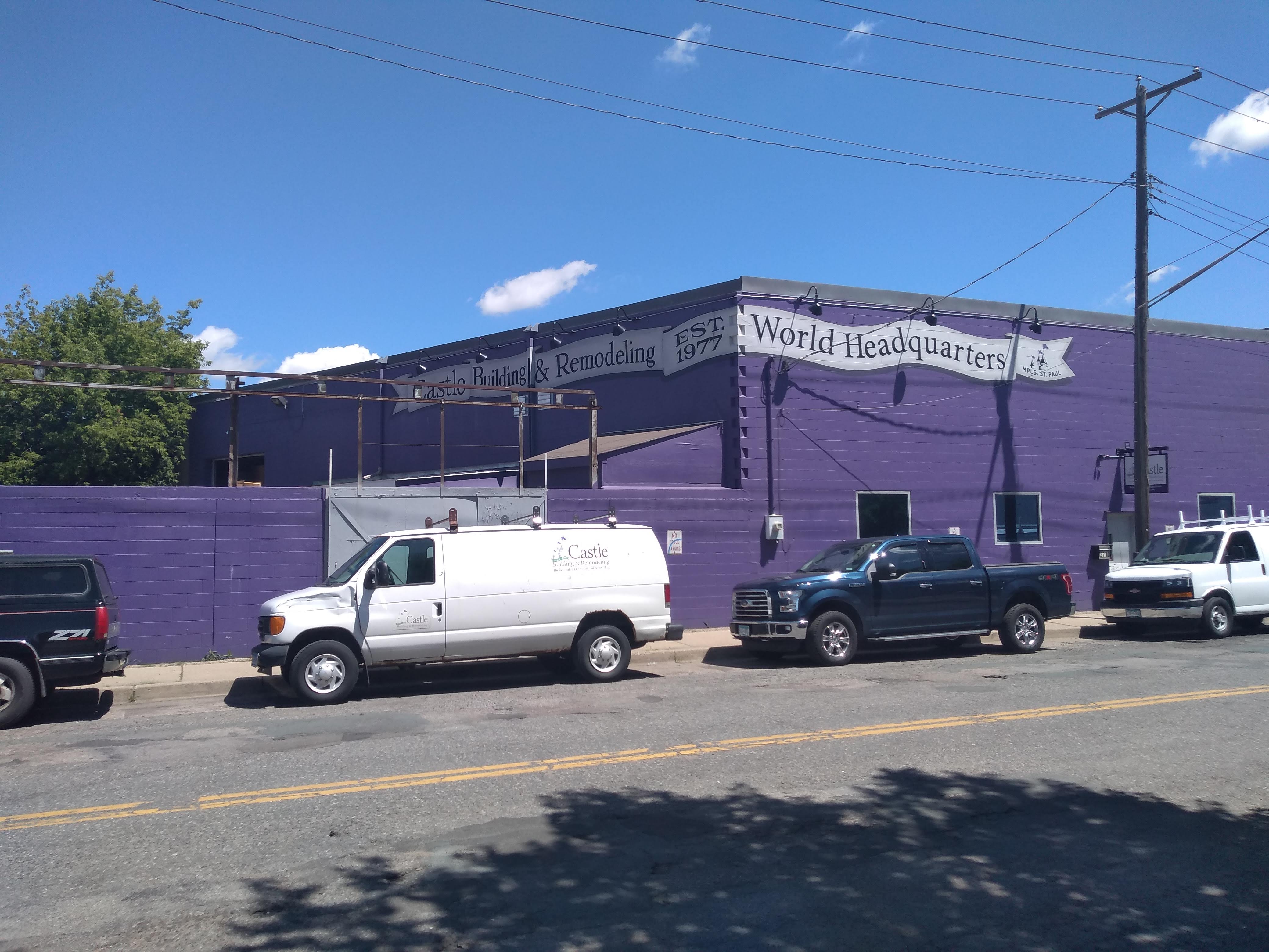To the west of the Trylon, the area turns industrial. The most visually striking building (again thanks to Phil Vandervaart) is the “Castle Building & Remodeling World Headquarters,” or what their web site more prosaically refers to as the production warehouse and company headquarters as opposed to the four design selection studios. Given that one of the four is in St. Paul, the expansion from Minneapolis to the world is well underway.