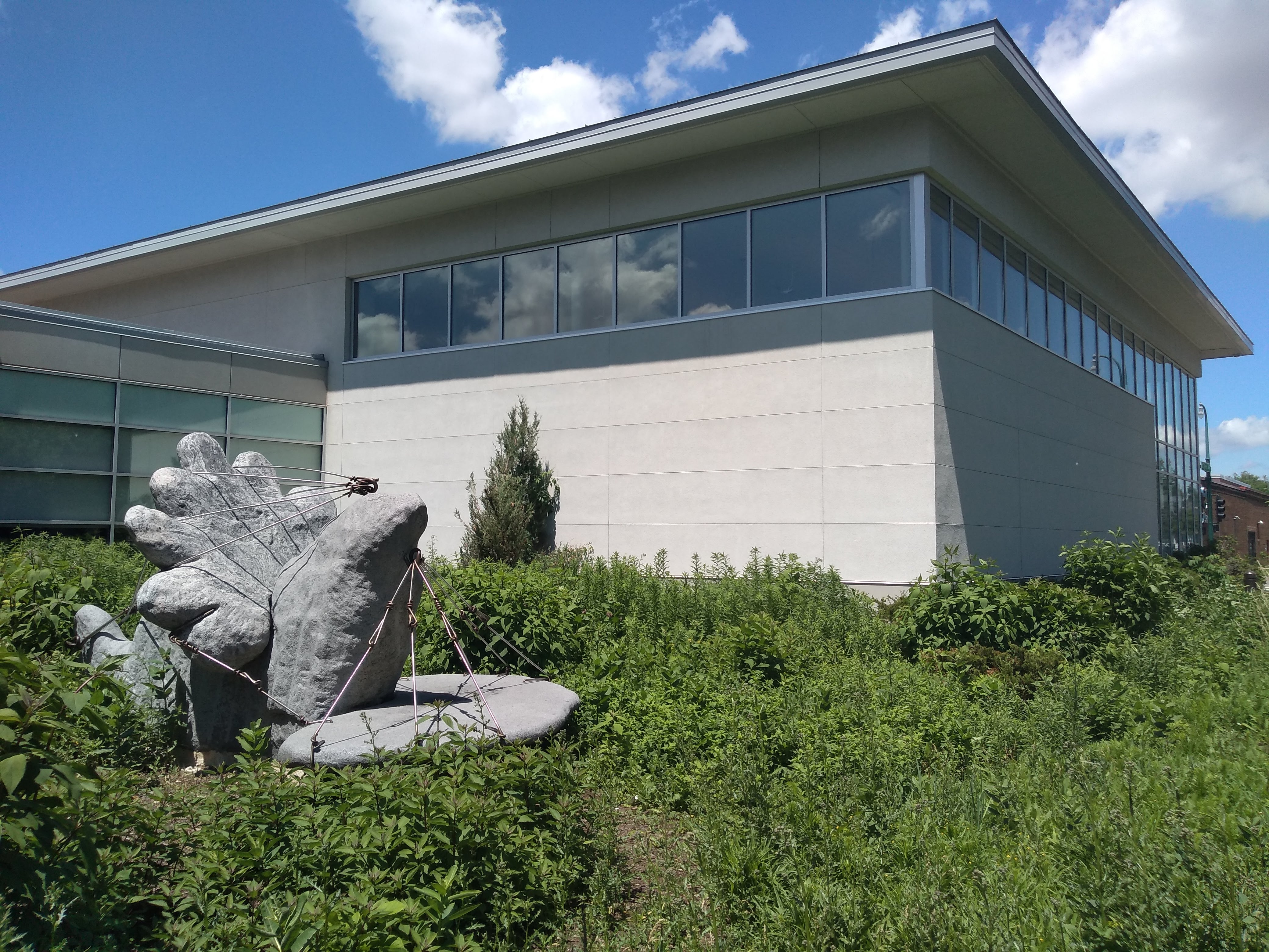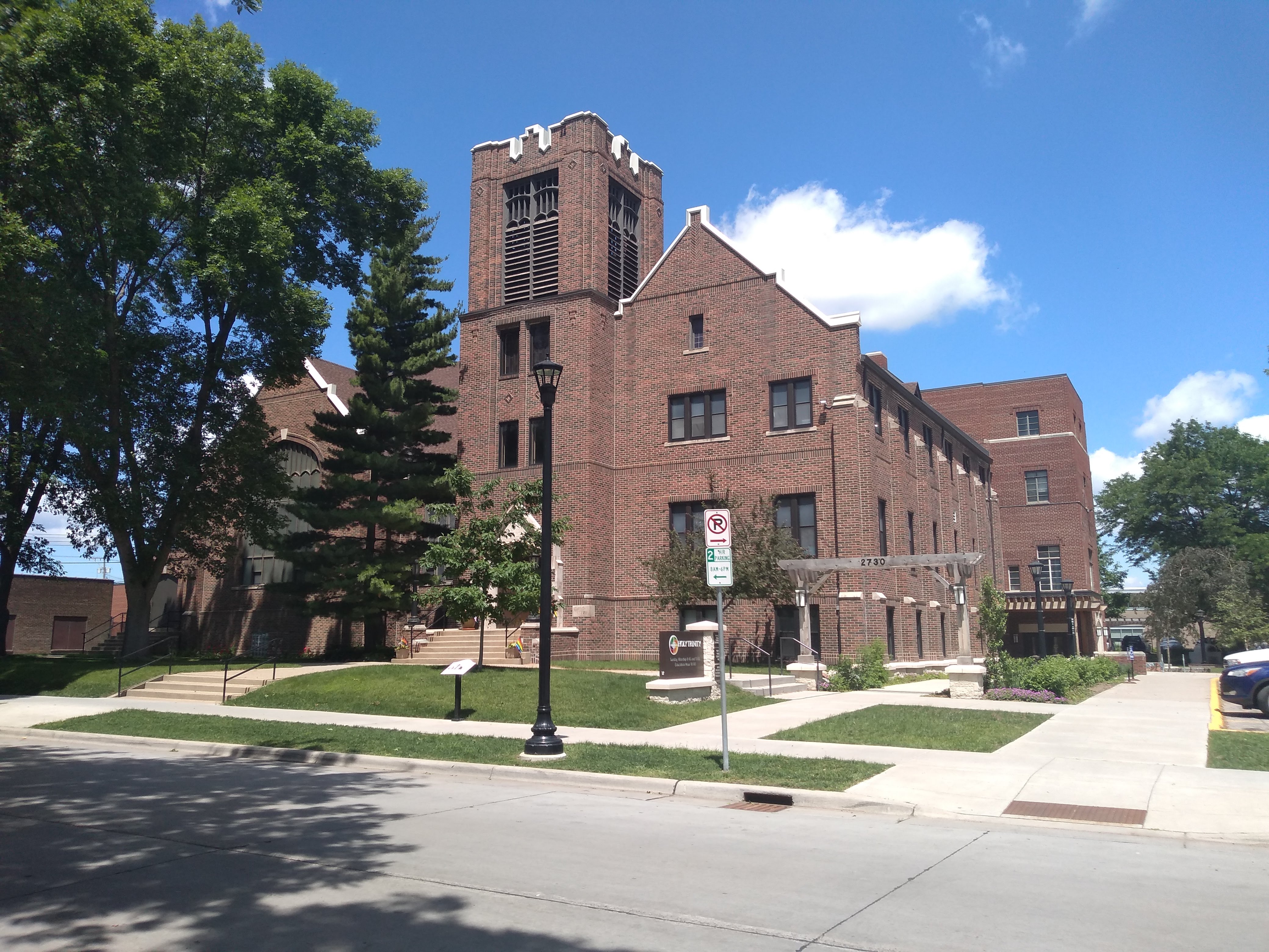 Viewing the sculpture required entering the courtyard area between the library and Trinity on Lake Apartments, at right in the following photo. A pedestrian trail runs through there on the 28th Avenue alignment to the 31st Street Trinity campus I previously photographed. The gateway at the entrance to that trail—shown here looking north toward Lake Street—is labeled “Holy Trinity Lutheran Church” and sports a three-dimensional cross.