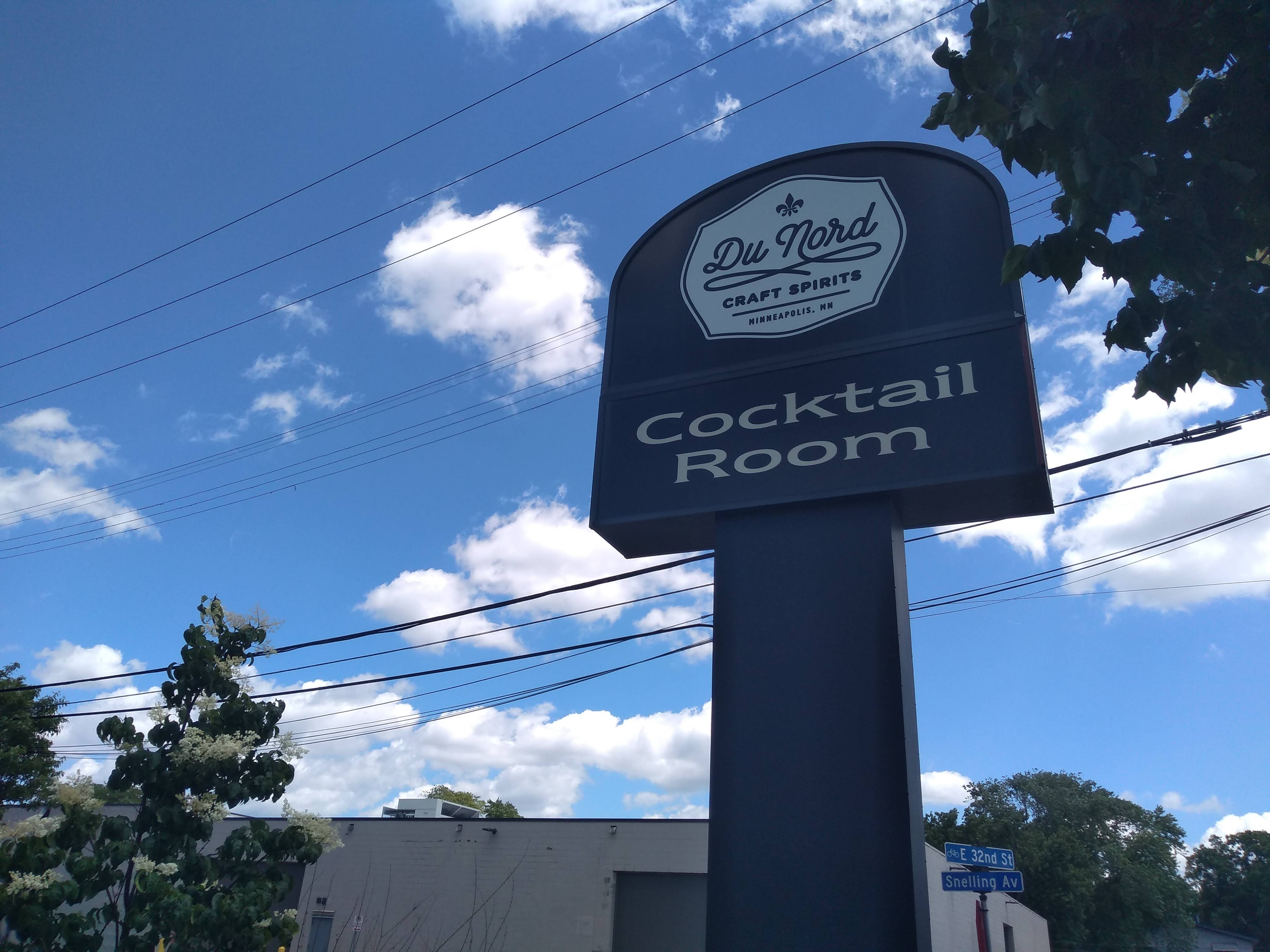Resuming out westward traversal of 32nd Street beyond Minnehaha Avenue, we encountered some evidence of the industrial area’s evolution at Snelling Avenue. On the southwest corner of the intersection, Overproof Screen Printing brings a 21st-century aesthetic to a 1917 industrial building (once part of the Minneapolis-Moline complex), while on the northwest corner, Du Nord Craft Spirits advertises their cocktail room (sadly closed at this hour).