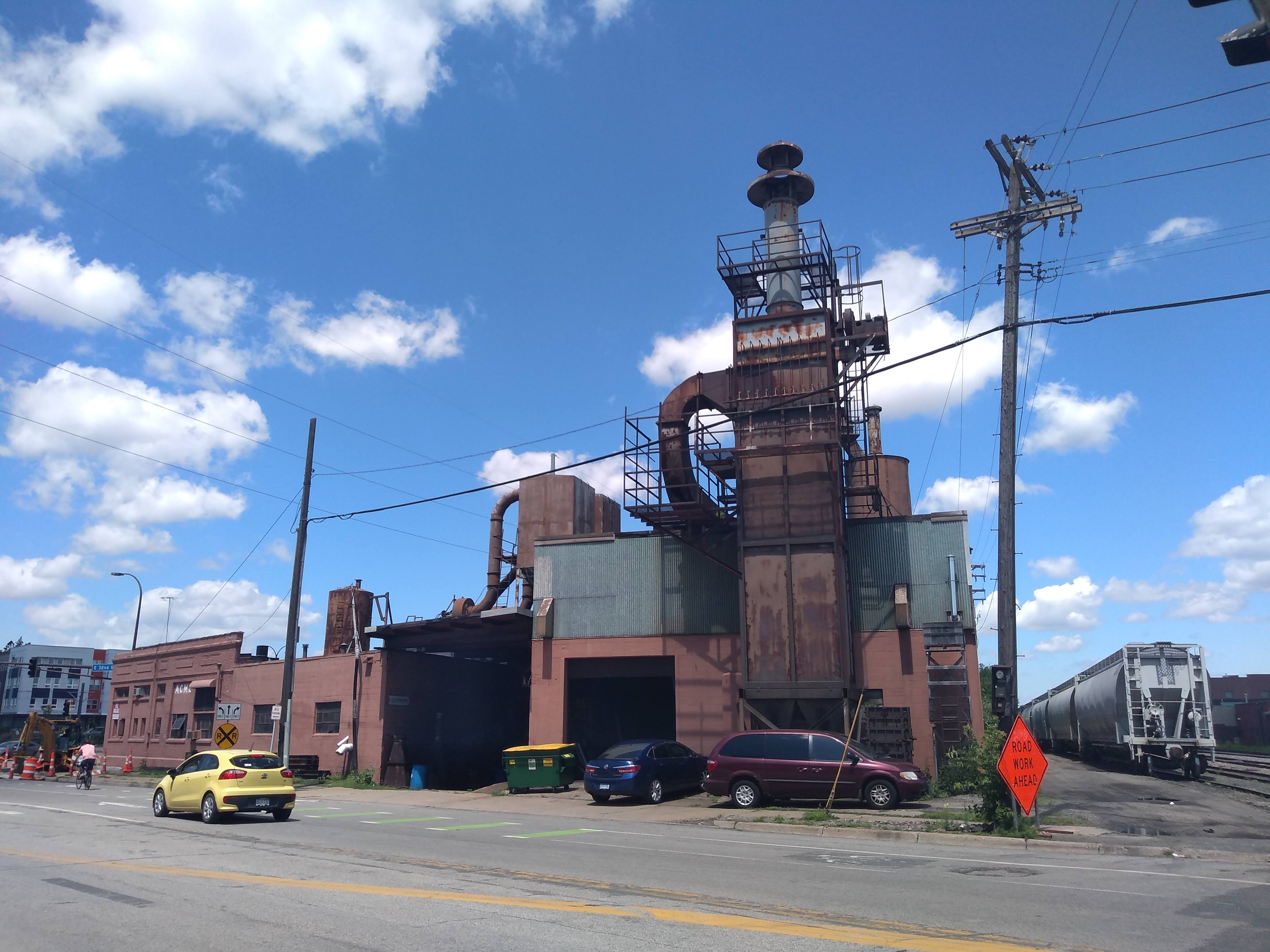 The building on the northeast corner with Hiawatha Avenue, on the other hand, is still serving a more longstanding industrial role—at least for the moment. “Founded in 1906” (yes, they really used “founded”), Acme Foundry casts iron at this site, but it was just recently listed for sale with particular mention of its redevelopment potential.