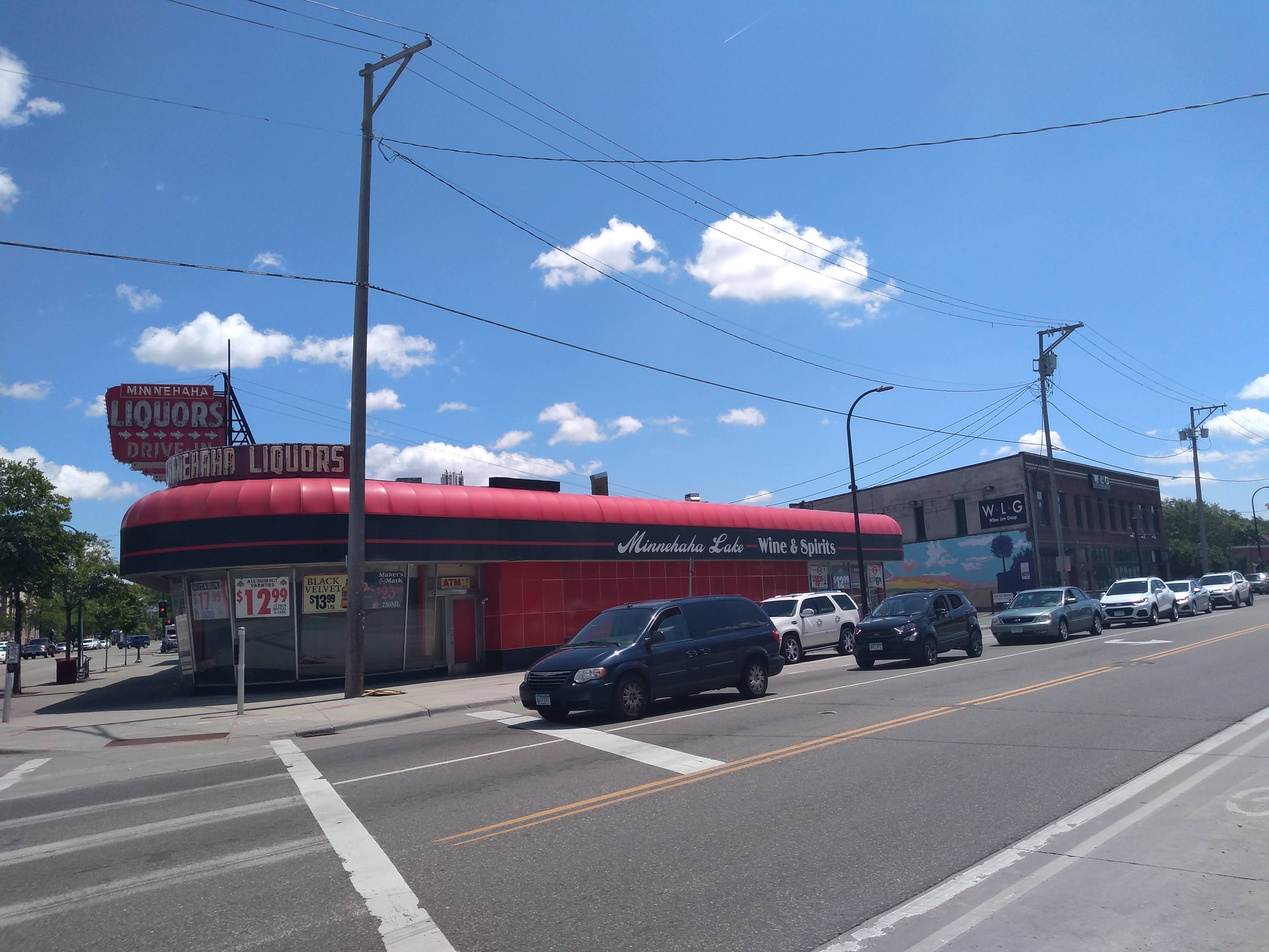 The pedestrian trail on the east side of Hiawatha Avenue is currently under construction, so we needed to detour out of the neighborhood to the west side before re-entering on Lake Street. Across Minnehaha Avenue from the police station I photographed on the prior walk, Minnehaha Lake Wine & Spirits (also known as Minnehaha Liquors) is a highly visible landmark with a streamlined curve.