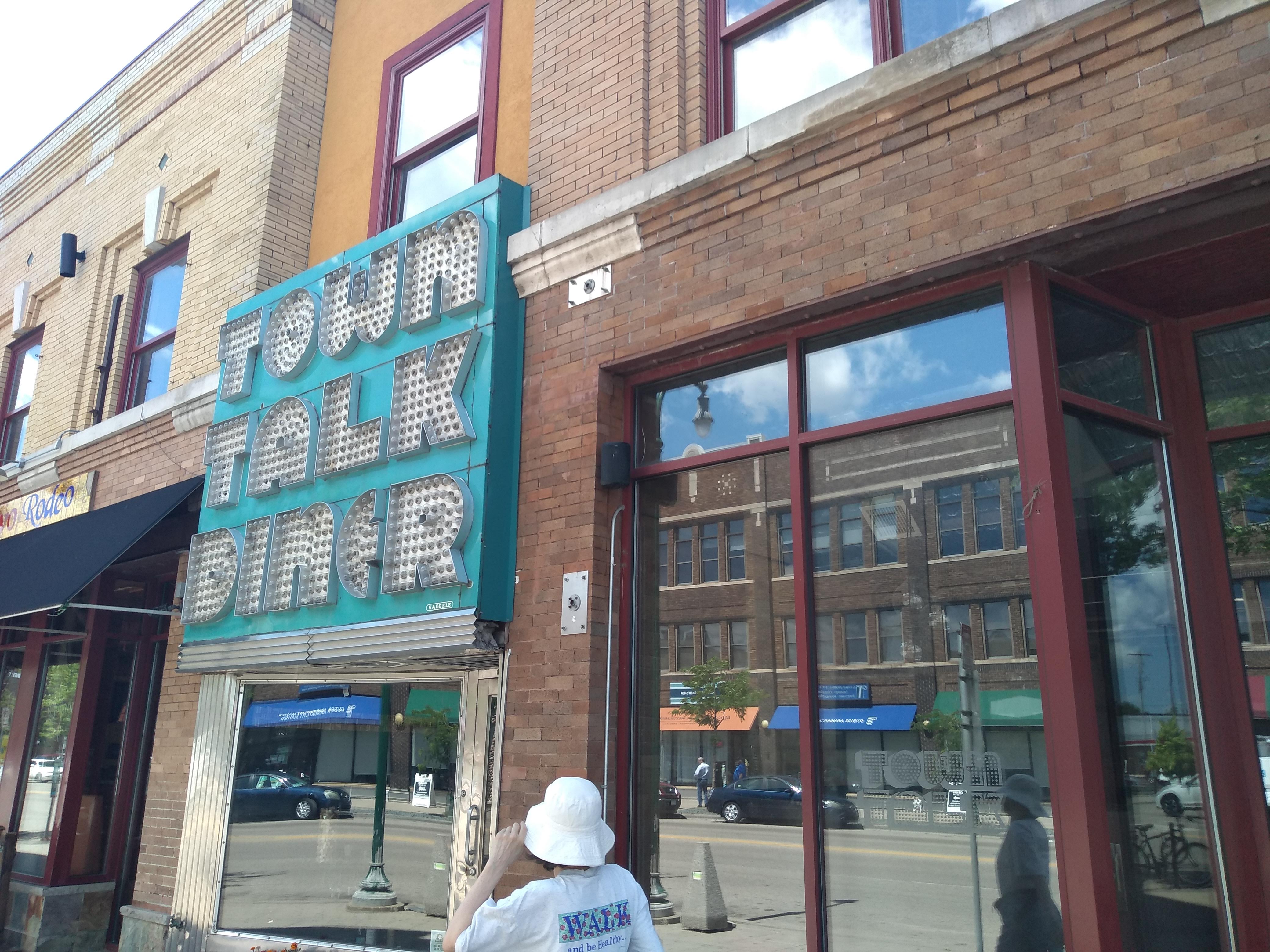 A block further west, the Coliseum Building on the northeast corner is the former Freeman’s Department Store (1917–1975), the subject of the ghost sign I saw on the prior walk. This is the same intersection that has the Odd Fellows building on the southeast corner. Just beyond that is Town Talk Diner & Gastropub. Indeed although the 1946 diner portion is just beyond the Odd Fellows building, the main portion of the restaurant extends into the Odd Fellows building, at the right of the photo.