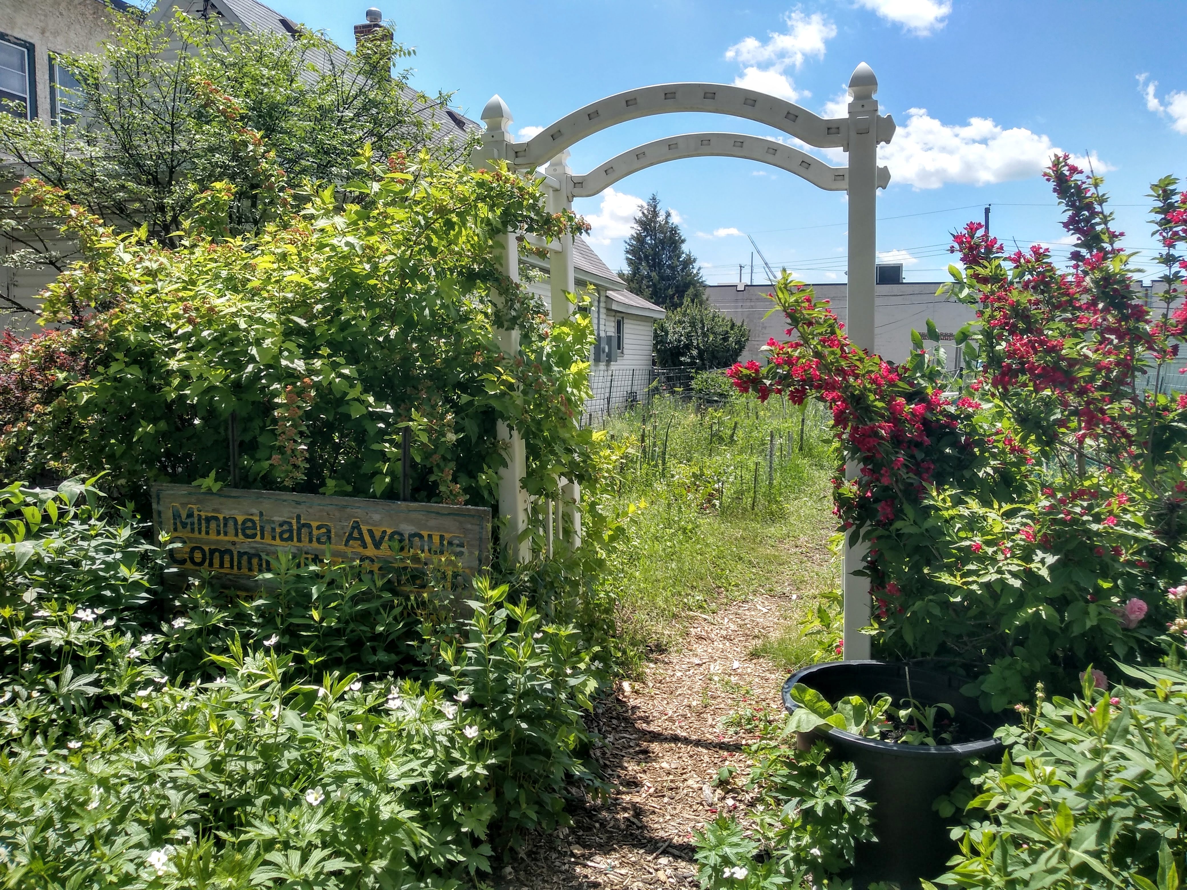 In the next block north, across the avenue from the Bradshaw funeral home, the Minnehaha Avenue Community Garden featured such exuberant growth that the sign was scarcely visible. It’s fun to compare this photo with Janelle Nivens’s from three years earlier, part of her remarkable Minneapolis Saunter.