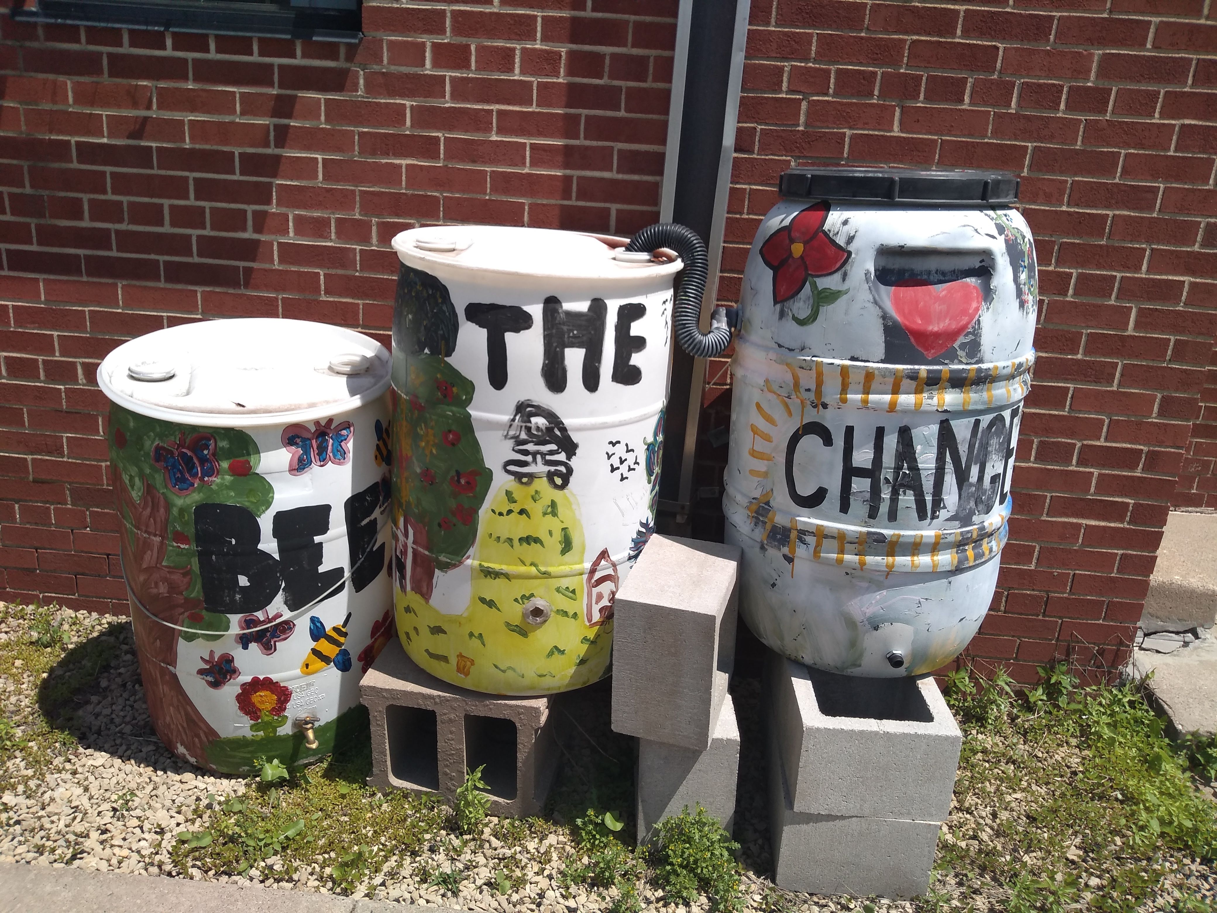 From Minnehaha, the route’s main loop turned east on 31st Street. First, though, we needed to do a very short spur further north on Minnehaha in order to meet up with the prior day’s walk where it turned the hairpin corner from Minnehaha to 27th Avenue. That brought us past the local post office, where someone had set up a clever trio of rain barrels painted with a reminder to “bee the change.”