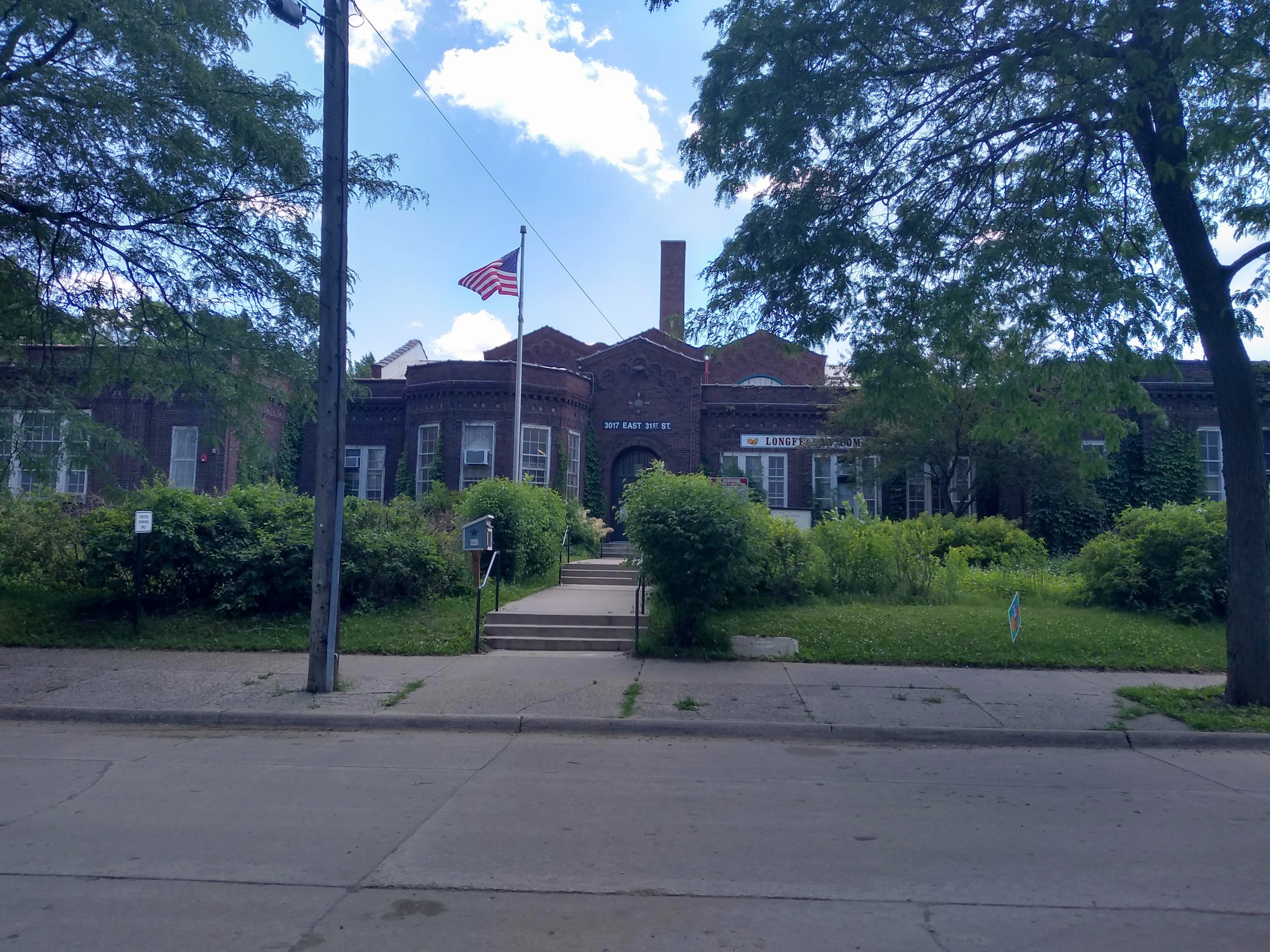 In the next block of 31st Avenue, we passed the western side of Longfellow Alternative High School, “A school designated for pregnant and parenting teens.” The main facade on is on 31st Street, so I’ll hold off on a photo until passing that way at the end of the walk. However, the side view did interest me for the romanesque details of the main building and even more so for what lies behind that building. Namely, there are two modular structures labeled “Teen Parent Service Center” and then a large play area clearly designed for young children, not high schoolers. I’m happy to see that the school district is taking this multi-generational approach of co-locating an early learning center with the high school.