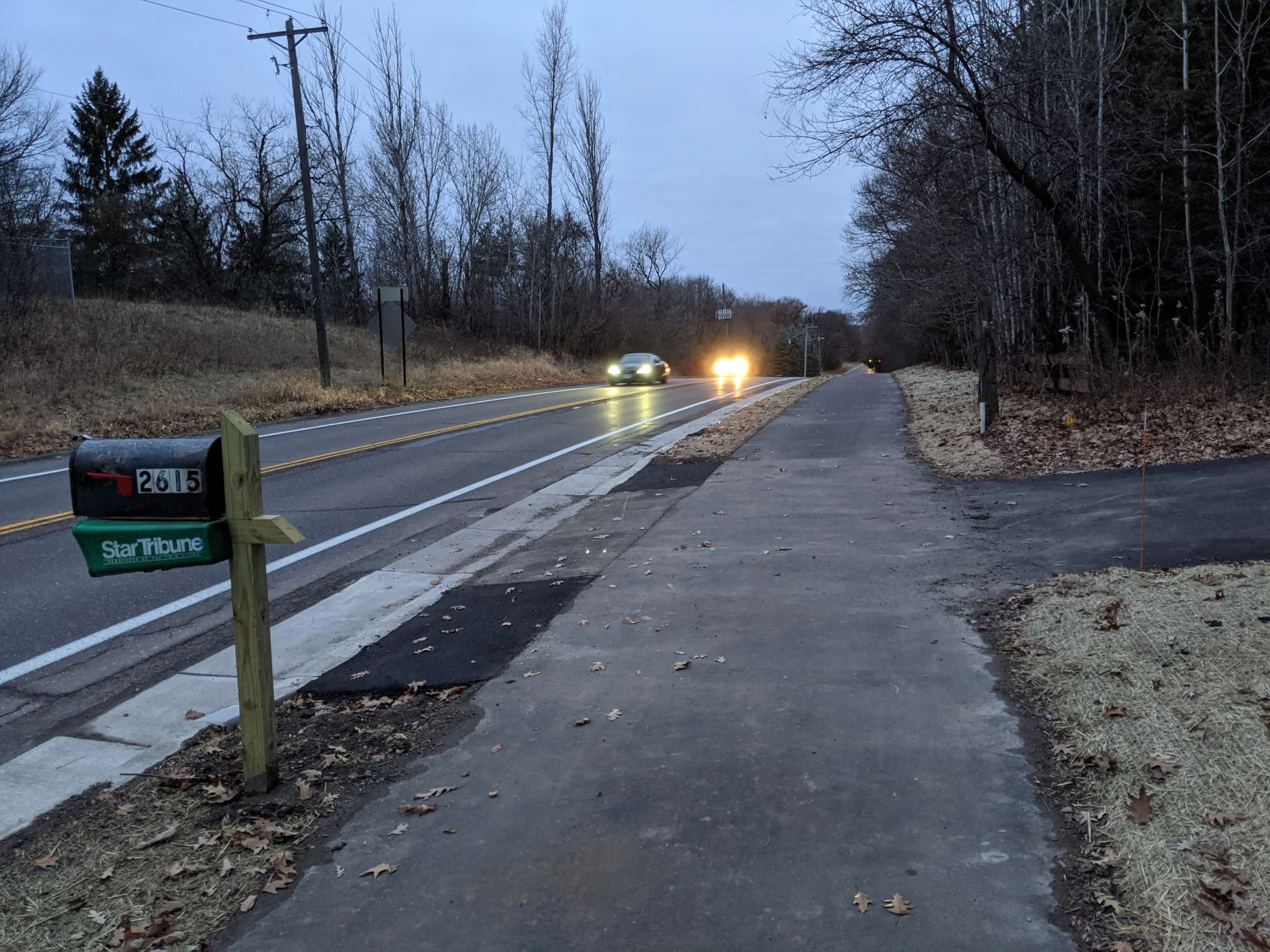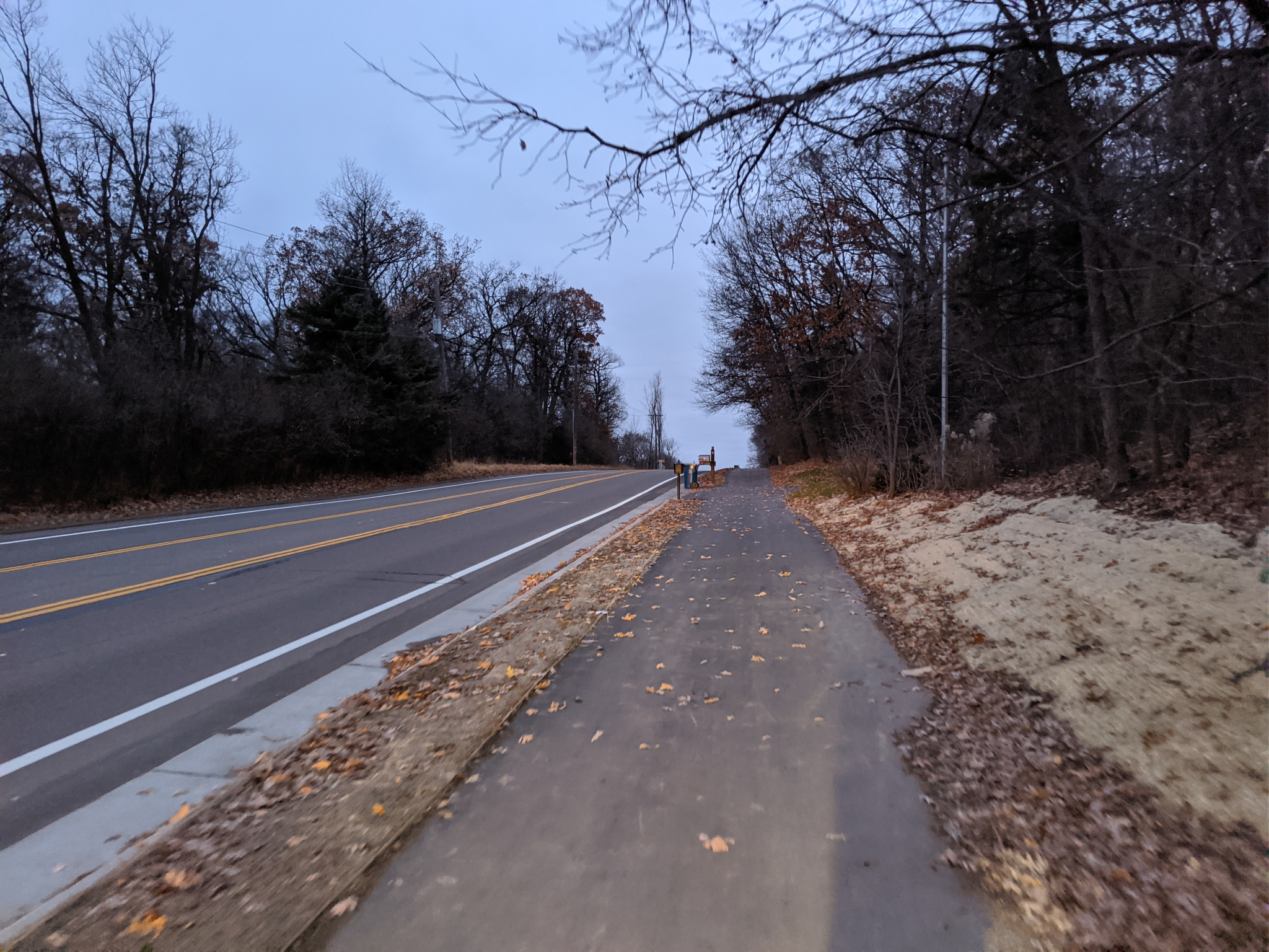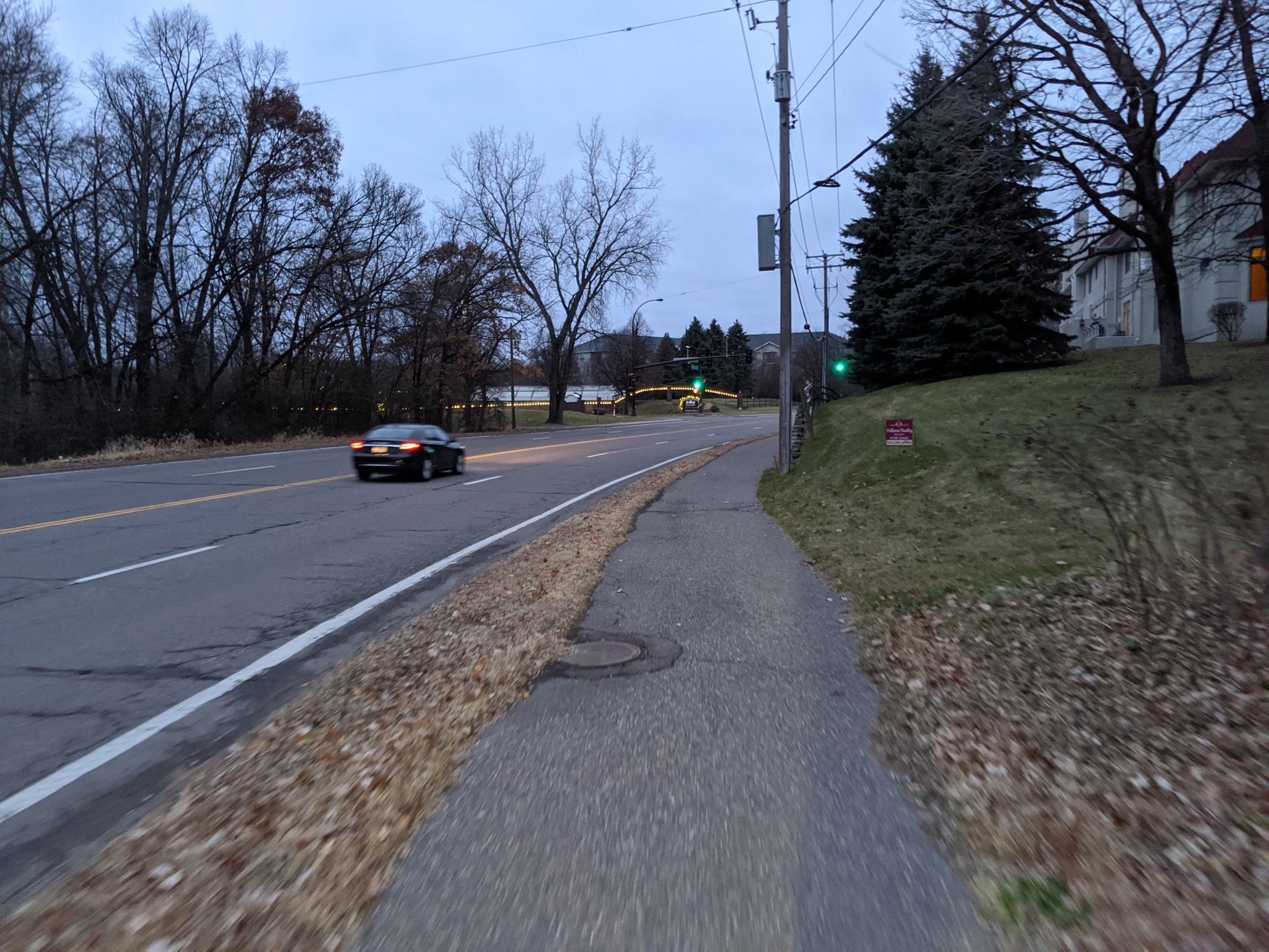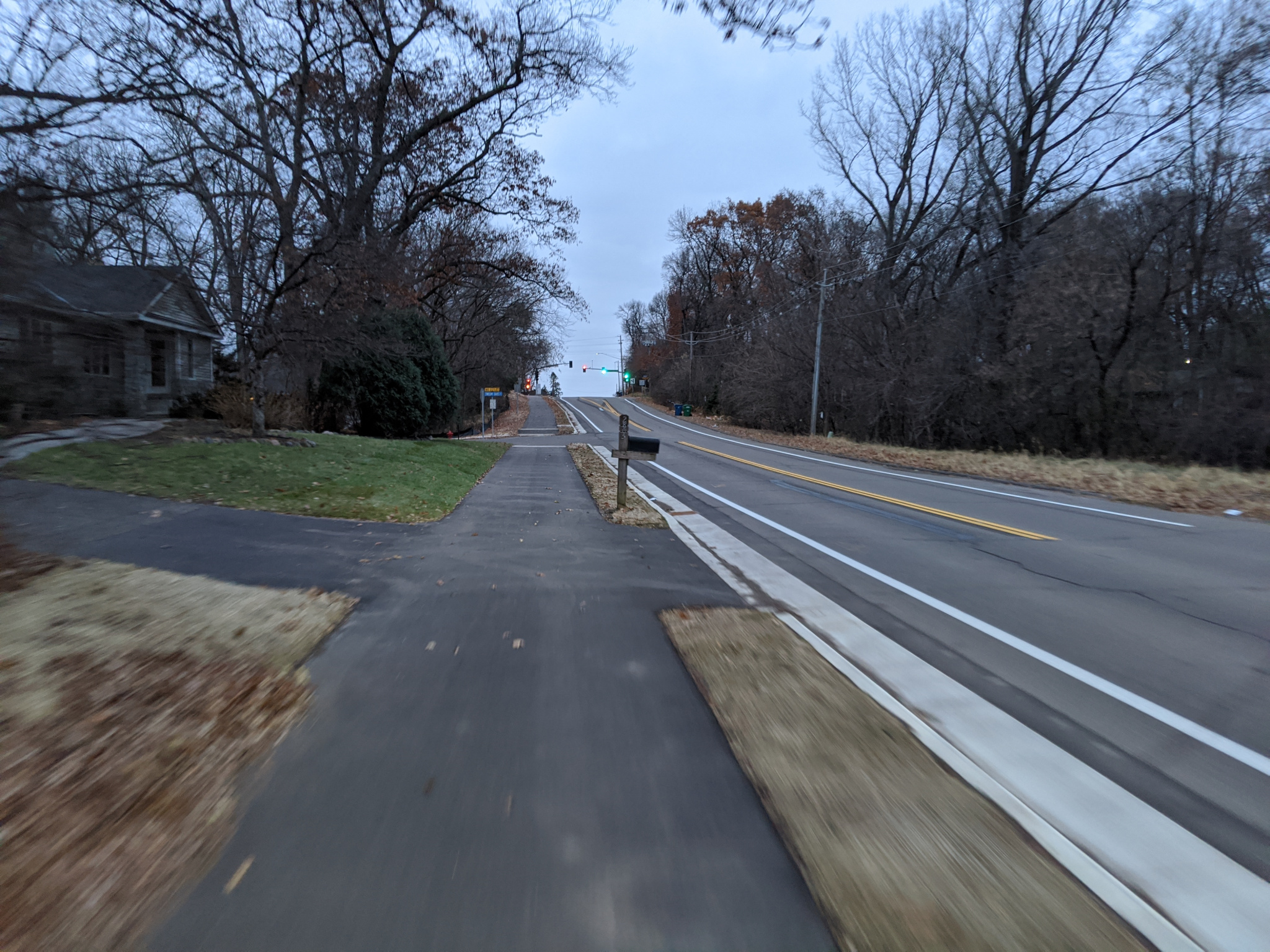 Riding back now towards the south end of the trail. Again, notice the flat crossings across private driveways. We are headed uphill here towards Cedar Lake Rd.