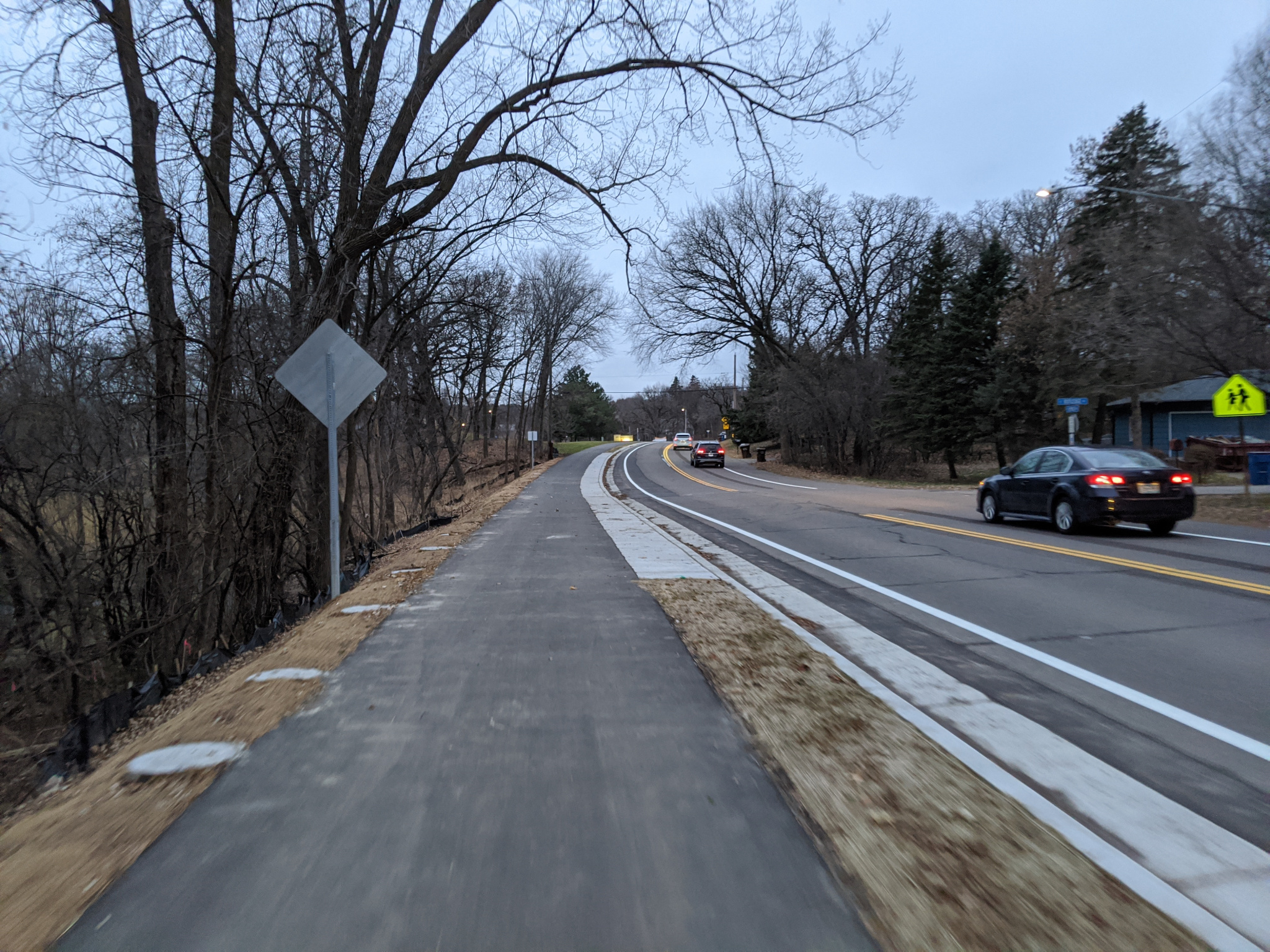 Both sides of the path are buffered with grass and trees. This will look good as growth develops. For a school zone crossing, I think this is sub par. Cars are zooming around here pretty fast and any children walking or biking in from adjacent neighborhoods need better protection. Hopefully they will address this in the near future.
