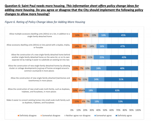 For champions of zoning reform, the responses from this early public engagement look pretty good. Respondents generally favored increasing small and medium-scale housing development in St. Paul. Hopefully, this will encourage planning staff to be bold with their proposals, knowing that there is public support for meaningful zoning changes.
