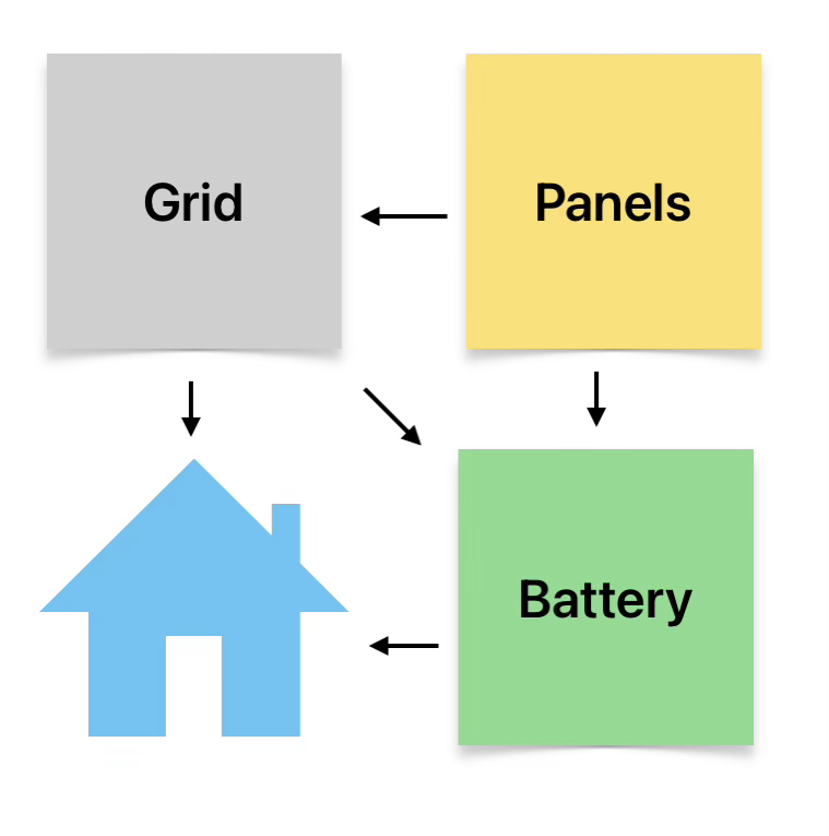 A solar-battery system is more dynamic. The grid can feed the house, but the panels and battery can, too.