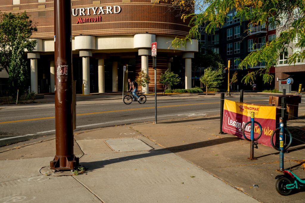 While walking, I began to reflect on how Minneapolis’ excellent bike infrastructure enhances the pedestrian experience. The network of dedicated bike lanes, greenways, parks and paths — and the integration with the broader transit system — both supports cycling and fosters a symbiotic relationship with pedestrian infrastructure. As I walked the city making landscape photographs, I was also inspired by how cyclists navigated the network. I’m drawn to the movement, energy and style of cycling. It brings a burst of energy and dynamism to public spaces that make them much more enjoyable. The strong sense of community, most visible in group bike rides, was contagious. As a pedestrian, I find no better allies and sources of inspiration than the cycling community.