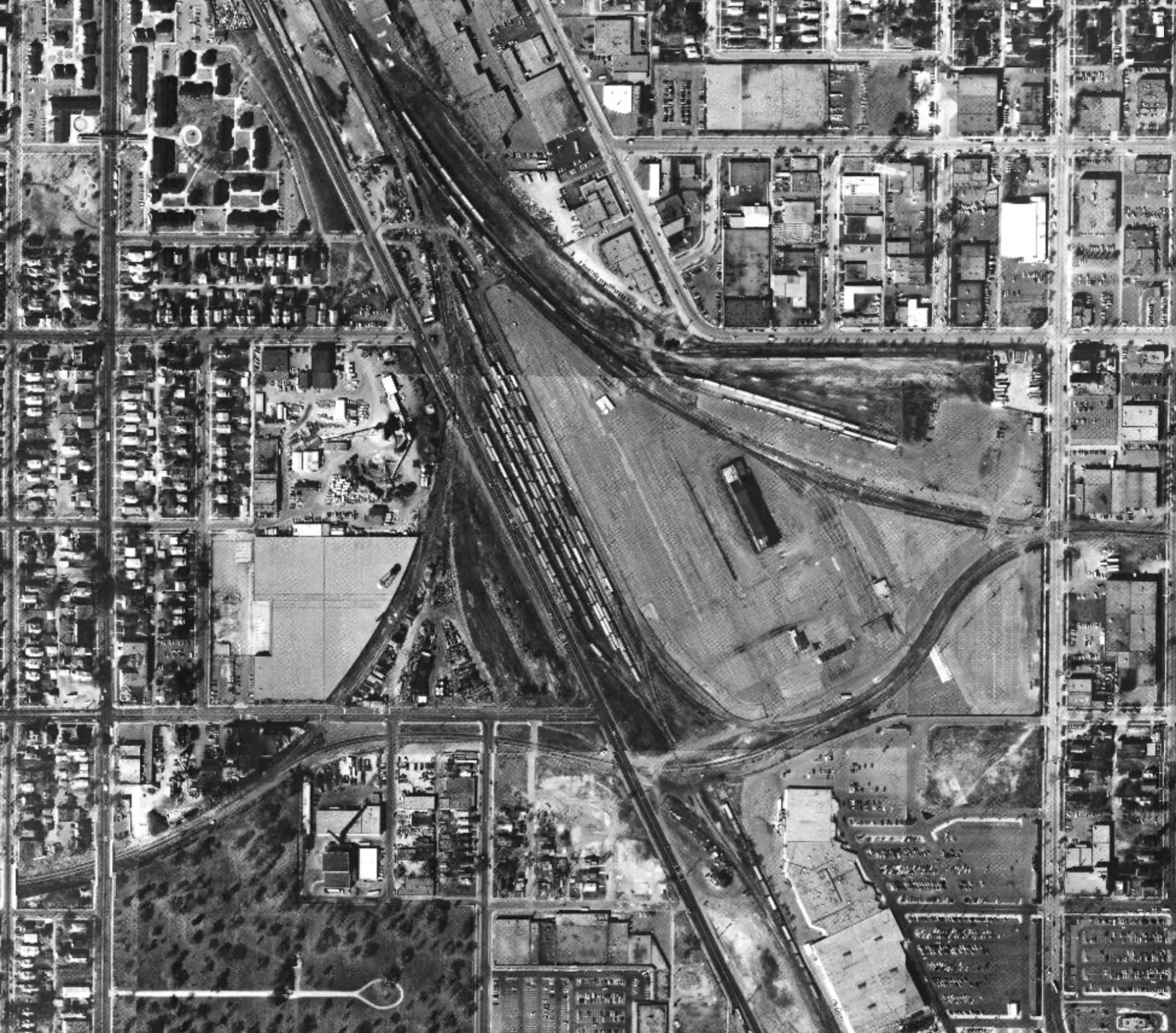 Another example is the pedestrian bridge over the Inspire Central apartment building between Emerson and Dupont avenues. Aerial photography shows that a siding ran north into the lot as recently as 1945 and had been removed by 1969. This land was historically used as a coal yard and later as a lumber yard.