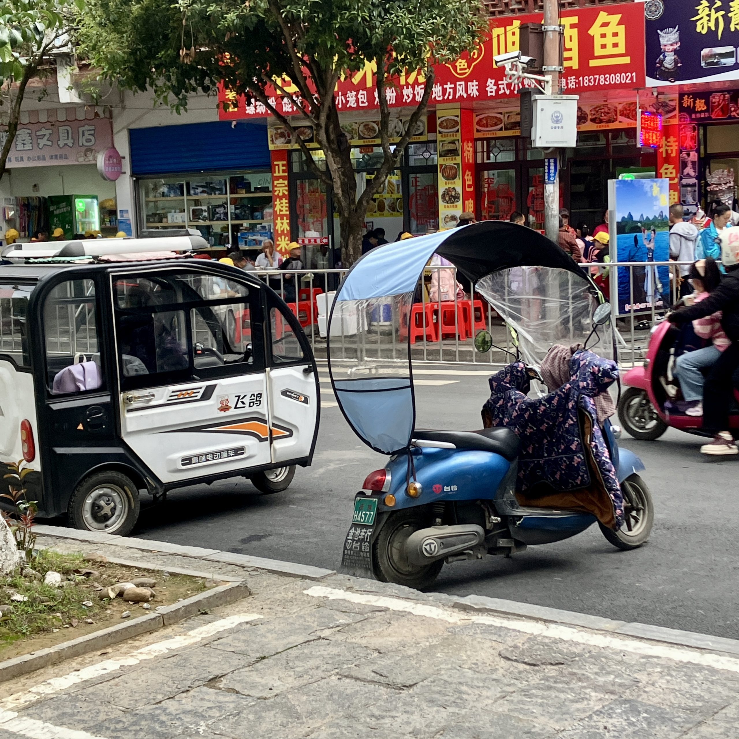 Electric mopeds, scooters and small three-wheeled vehicles are prolific. They take up less space on narrow streets, are quiet, zero-emission and are easy to charge by plugging into standard electrical outlets. Many scooters were cleverly outfitted for rain and cold with awnings and quilts.