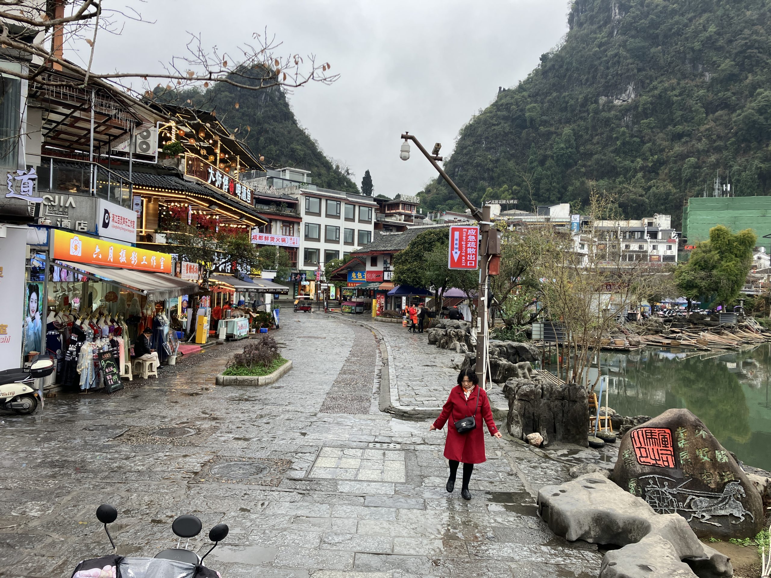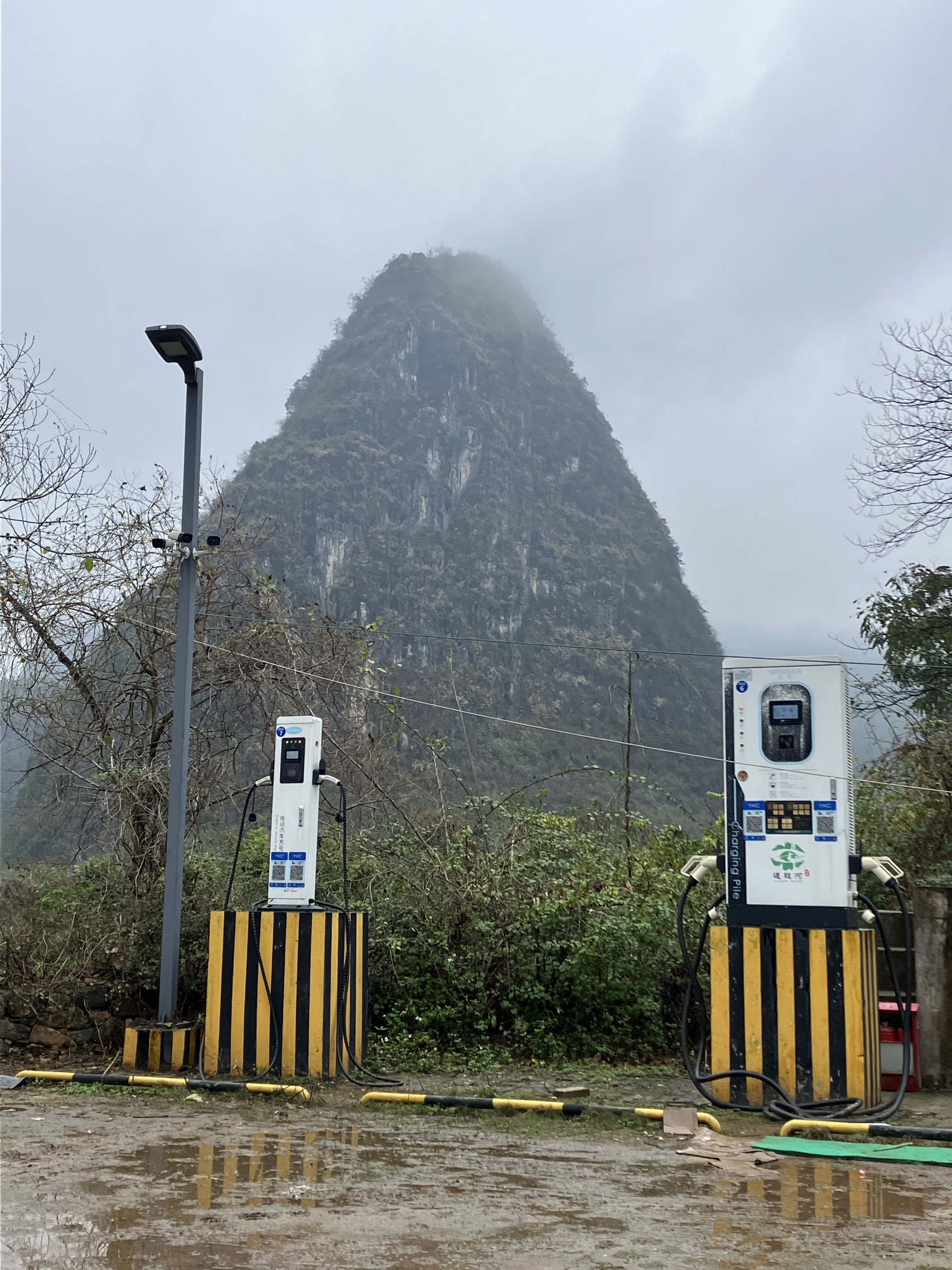Public charging infrastructure is abundant and convenient — even in remote areas and very small towns. This is outside the ancient city of Yangshuo, known for iconic karst limestone mountains.
