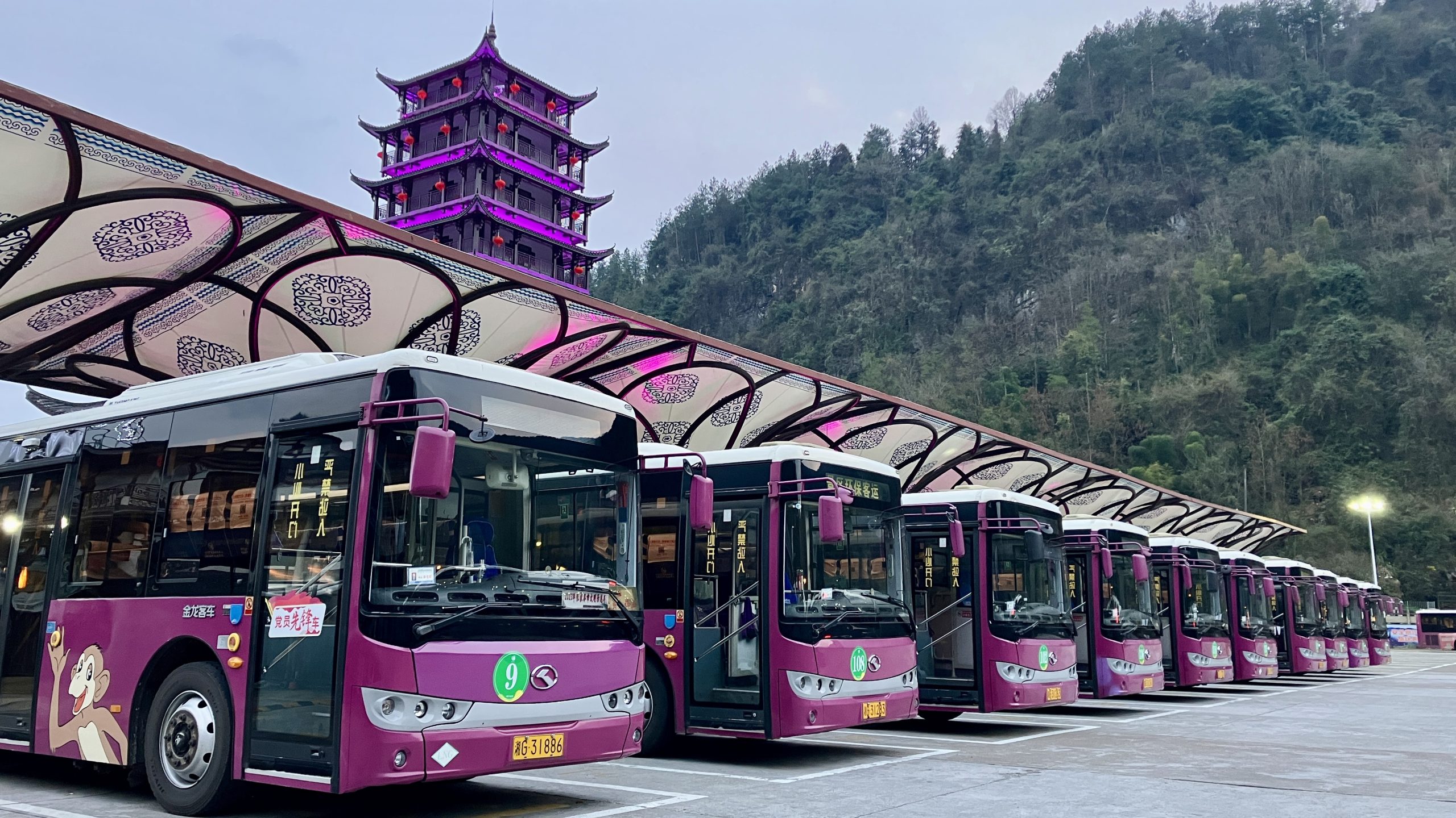 Bus service is unparalleled. This fleet serves visitors heading into Zhangjiajie National Forest Park, renowned for its dramatic, towering quartz-sandstone pillars which inspired the setting for the movie Avatar.